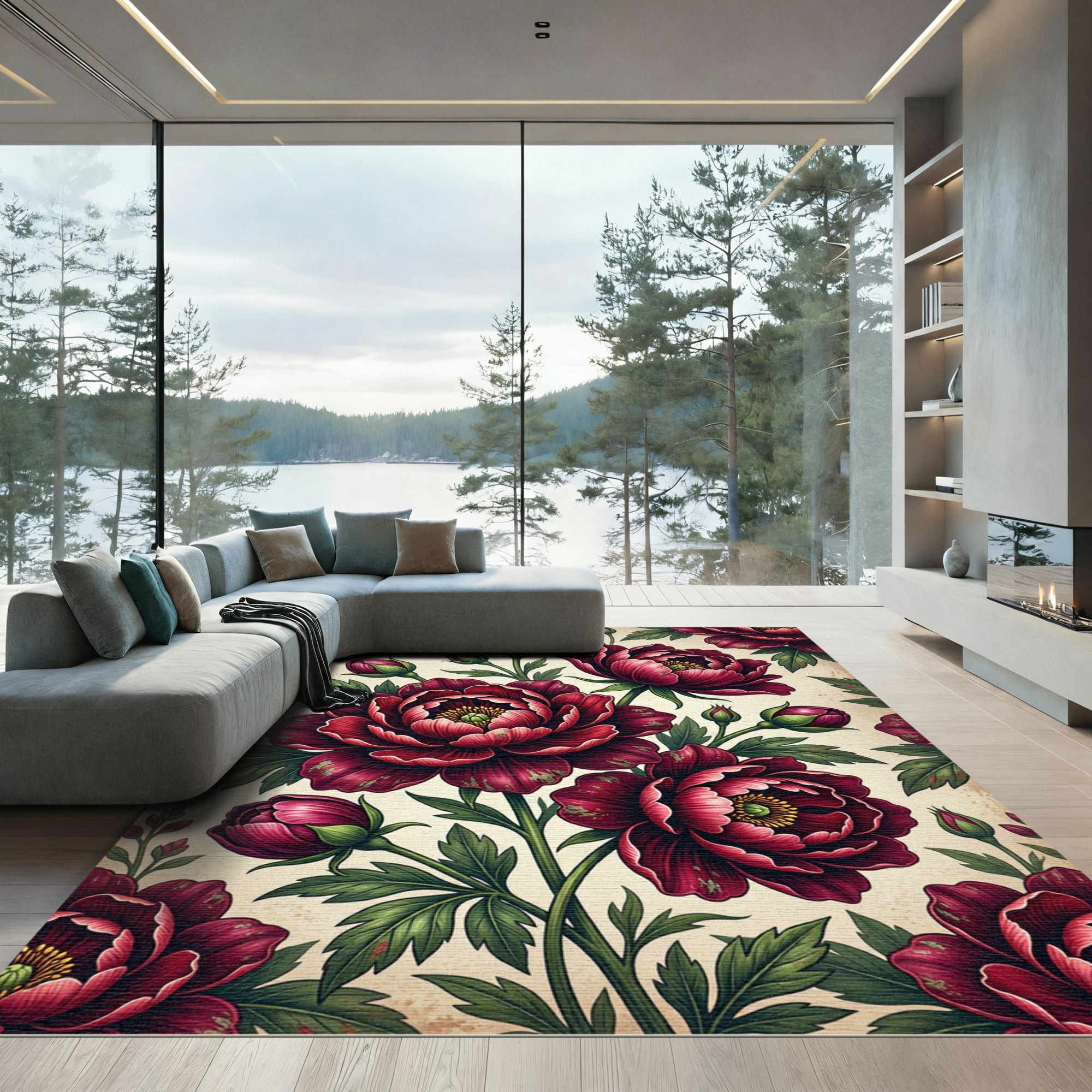 Elevate your home with this stunning vintage-inspired area rug, featuring lush crimson peonies set against a soft, neutral backdrop. Perfectly blending classic charm with modern convenience, this floral masterpiece is designed to be as practical as it is beautiful. Highly durable and fully machine washable, it is an ideal choice for high-traffic areas like the living room or entryway. With a low pile height that easily tucks under furniture and doors, it offers effortless maintenance for busy households. Every piece is certified OEKO-TEX Standard 100, ensuring your space is decorated with safe, high-quality textiles. Available in sizes from small accent rugs to spacious area rugs, it brings timeless elegance to any corner of your home.