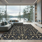 Drawing inspiration from the hallowed halls of Moorish architecture and the precision of Art Deco geometry, this rug serves as a visual bridge between ancient intricacy and contemporary poise. The design mirrors the rhythmic flow of a cathedral garden, where ivory-hued fleur-de-lis motifs bloom defiantly against a void-black backdrop, recalling the masterful symmetry found in Victorian stained glass. When you unfurl this piece, your room undergoes a quiet metamorphosis: the floor ceases to be merely a surface and becomes a curated tableau of shadow and light. It is intended for the soul drawn to depth over decorum, the collector who finds magic in the marriage of history and utility. This is not a rug—it is an anchor for the moody, evocative home. Step onto this scene; feel the room soften and time slow. Walk upon legacy. Live in reverence.