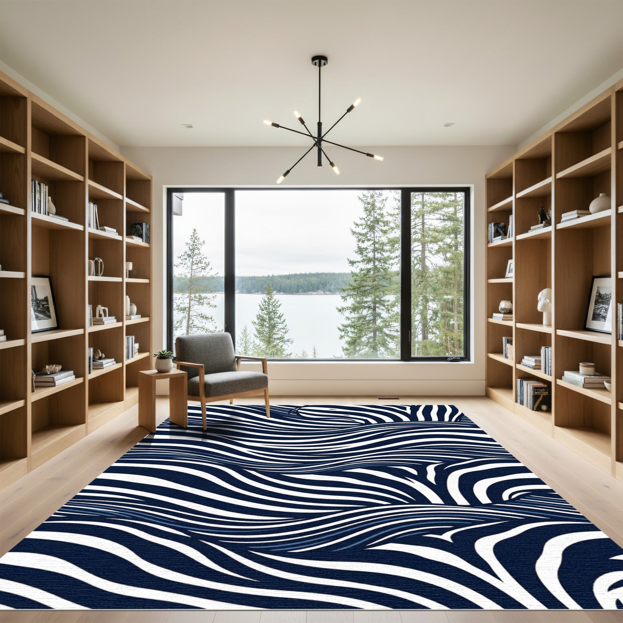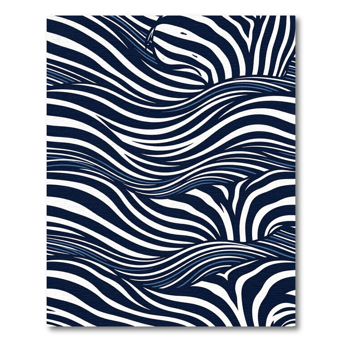 Drawing lineage from the fluid dynamism of Japanese woodblock prints and the high-contrast drama of midcentury animal-pattern revival, this design transforms the static floor into a shifting sea of deep-set indigo currents. Imagine the rhythm of rolling tides captured in ink, where stark white stripes surge like cresting waves against a midnight-blue abyss. This is a visual ode to the harmony of wild nature and modern geometric precision, reminiscent of the bold, graphic sensibilities found in 1960s kinetic art movements. When you place this rug in your home, the space undergoes a subtle metamorphosis—walls seem to inhale, and the floor becomes an expansive horizon, inviting a meditative stillness. This is for the soul who finds clarity in depth and strength in rhythmic movement. Don't just decorate your sanctuary; anchor it in the movement of the tides. Step onto this scene, and walk upon poetry.
