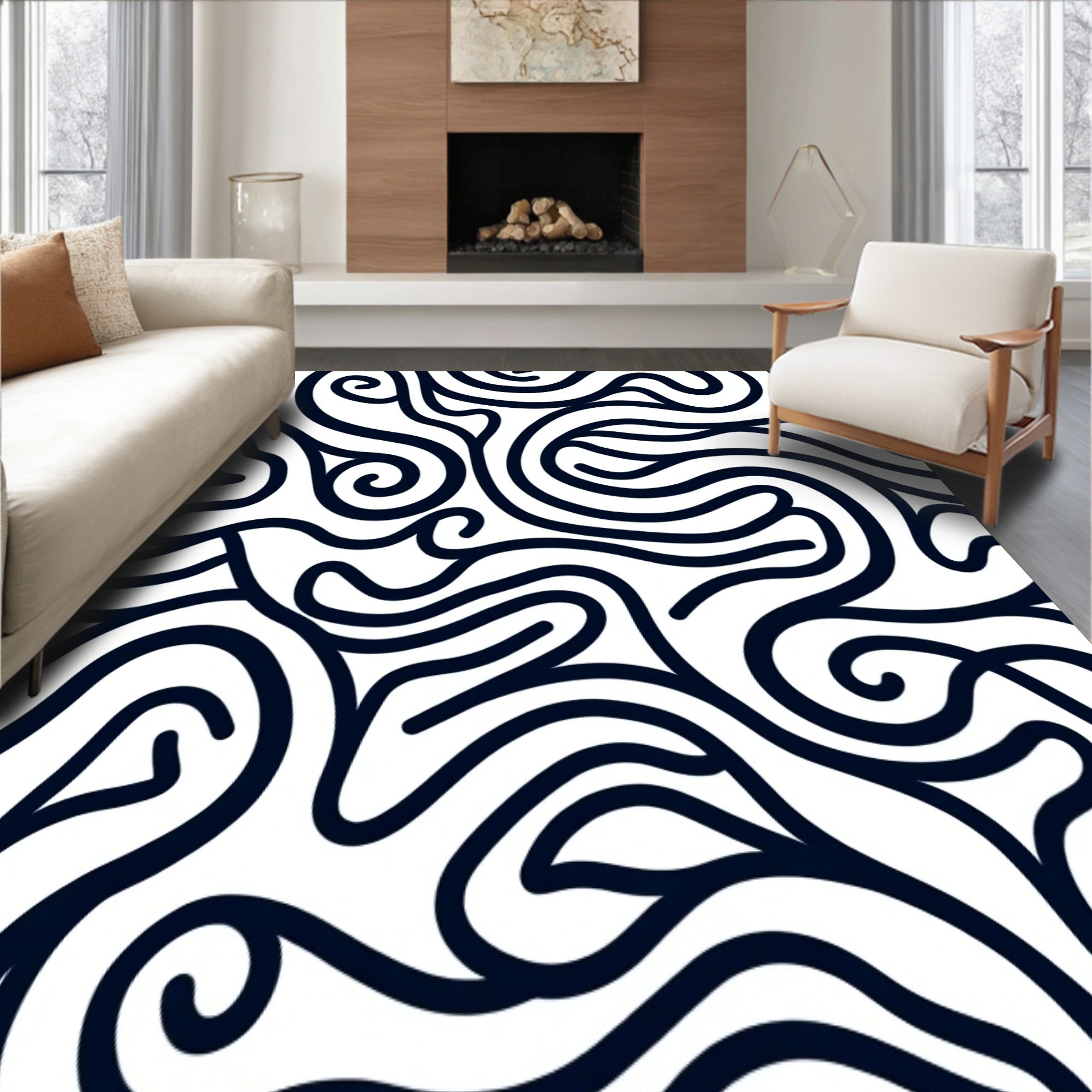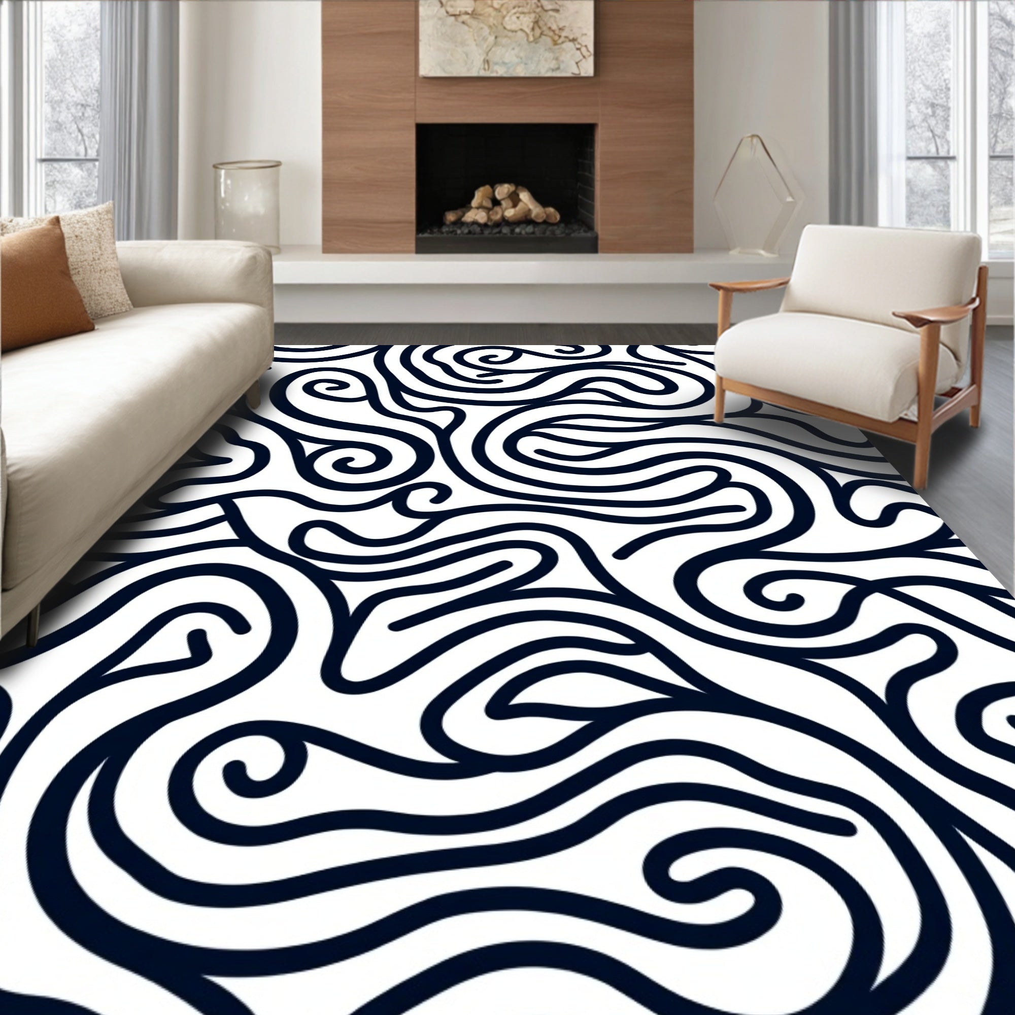 Flatwoven High Traffic Area Rug, Abstract Wavy Labyrinth Maze Stylish, Non Slip, Stain Resistant, Washable Area Rugs for Living Room, Bedroom (Black) Overview: