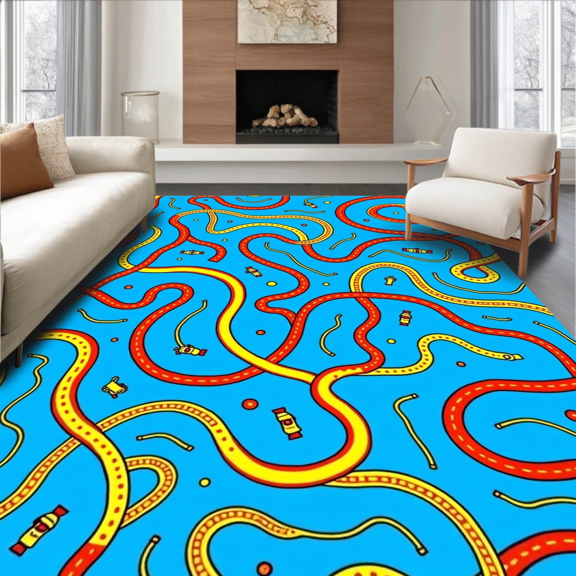 Flatwoven High Traffic Area Rug, Adventure Roadway Map with Interlocking Tracks and Playful Vehicles Motif, Non Slip, Stain Resistant, Washable Area Rugs for Living Room, Bedroom (Blue) Overview: