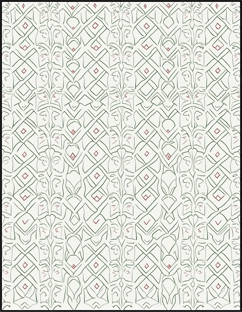 Rooted in the organic symmetry of Art Nouveau but reimagined through the prism of Brooklyn industrial-modernism, this design serves as a visual bridge between botanical grace and structural order. The delicate emerald linework flows with the rhythmic pulse of a secret garden, where stylized clover-like curves intertwine with sharp, hand-sketched rubies to create a living tapestry. It is a visual ode to the Neo-Storytelling movement, inviting the eye to follow its endless, labyrinthine paths. When placed in a room, the atmosphere undergoes a quiet metamorphosis; concrete-cold floors are replaced by a zen-like field of mint-kissed serenity. This rug is crafted for the soul drawn to intentionality—the heart-led homebuilder who finds beauty in the intersection of logic and wonder. It transforms a simple floor into a curated tableau of hushed elegance. Don’t just decorate your sanctuary—anchor it with a piece that speaks in whispers of timeless geometry. Walk upon poetry and live in reverence.