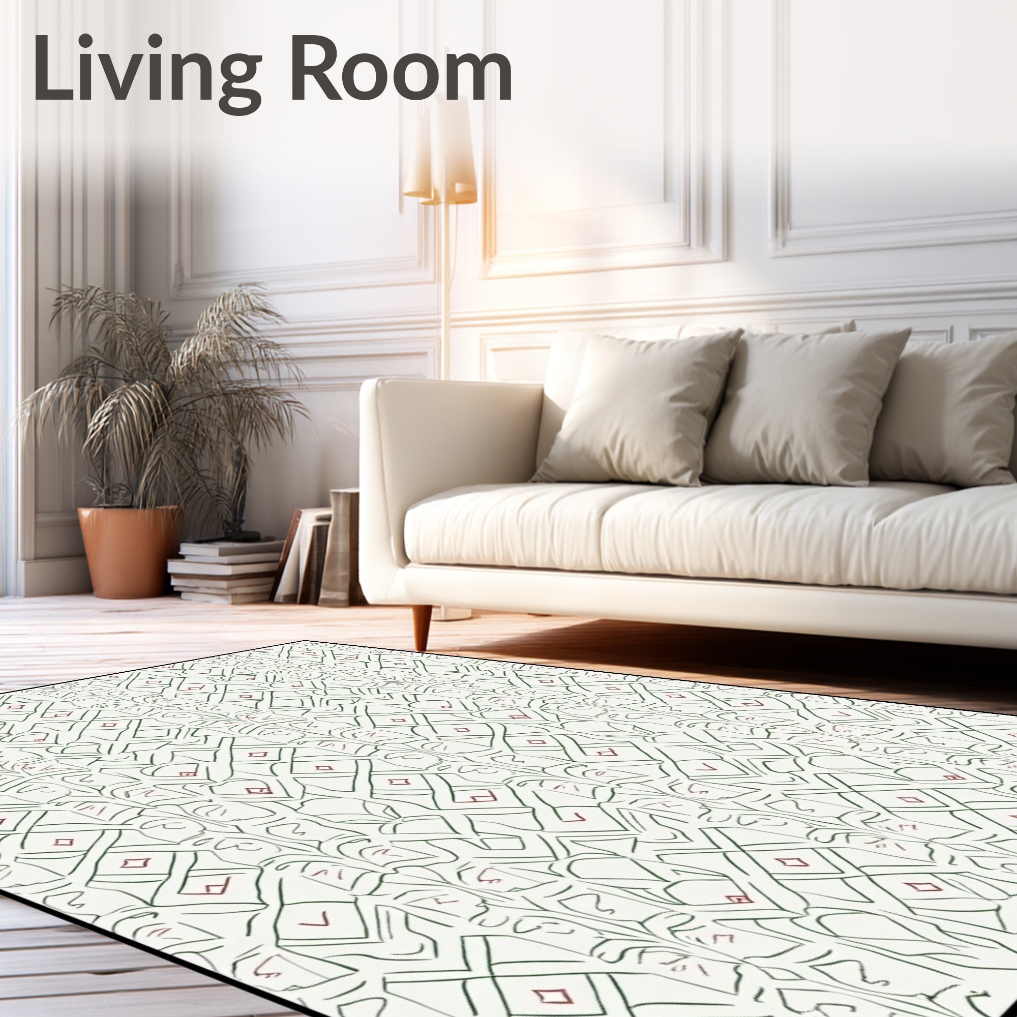 Elevate your living room with the Emerald Clover Diamond Overlay Ornament Rug, a masterpiece of contemporary linework and geometric sophistication. Featuring a delicate interlocking motif of emerald green vines and ruby-accented diamonds set against a crisp mint-white background, this area rug offers a refreshing alternative to traditional patterns. Its durable construction is engineered for high-traffic homes, ensuring the intricate design remains sharp over time. Because life happens, the machine washable material makes maintenance effortless, while the OEKO-TEX Standard 100 certification guarantees a safe, toxin-free surface for your family and pets. The low pile height ensures a seamless fit under doors and a sleek, effortless profile.