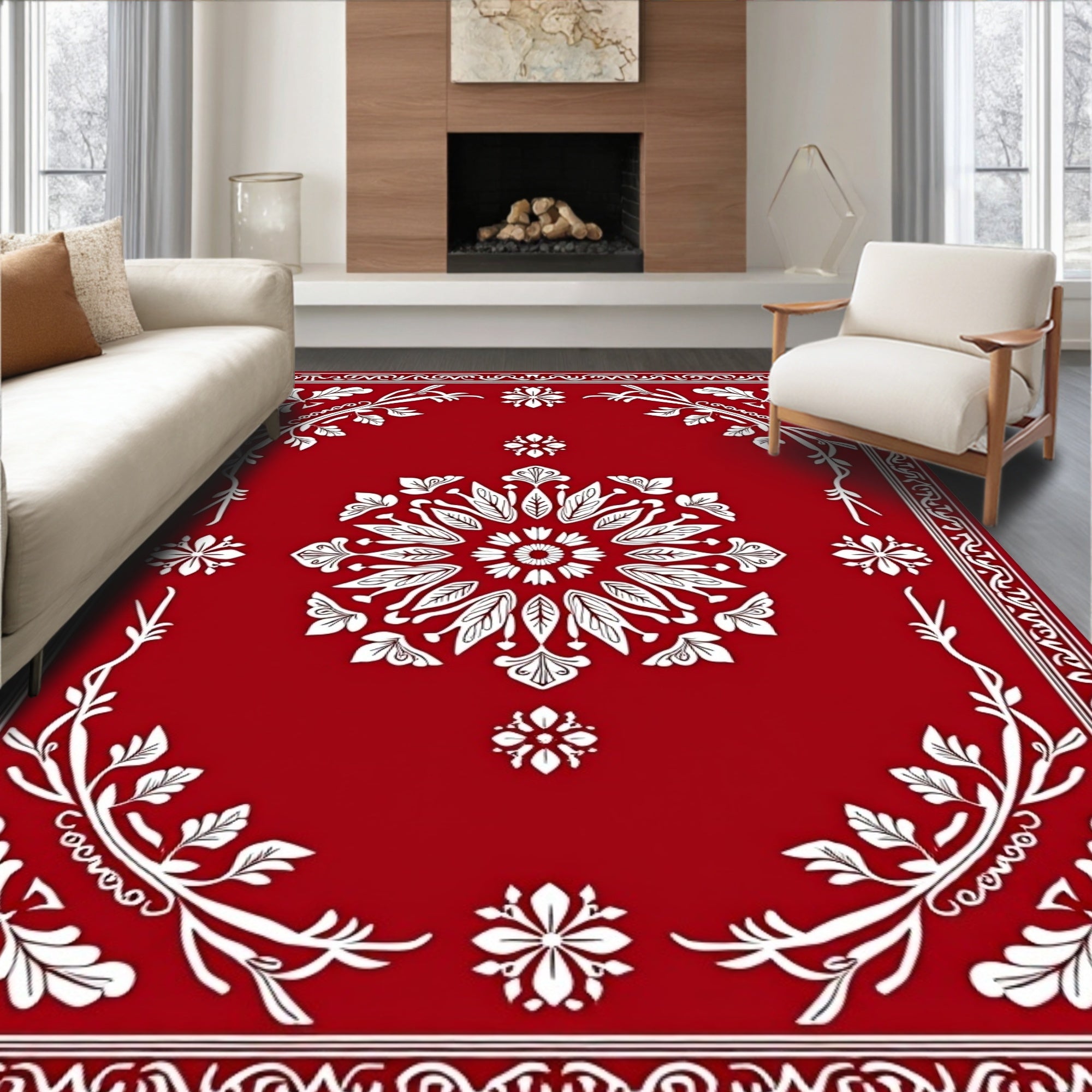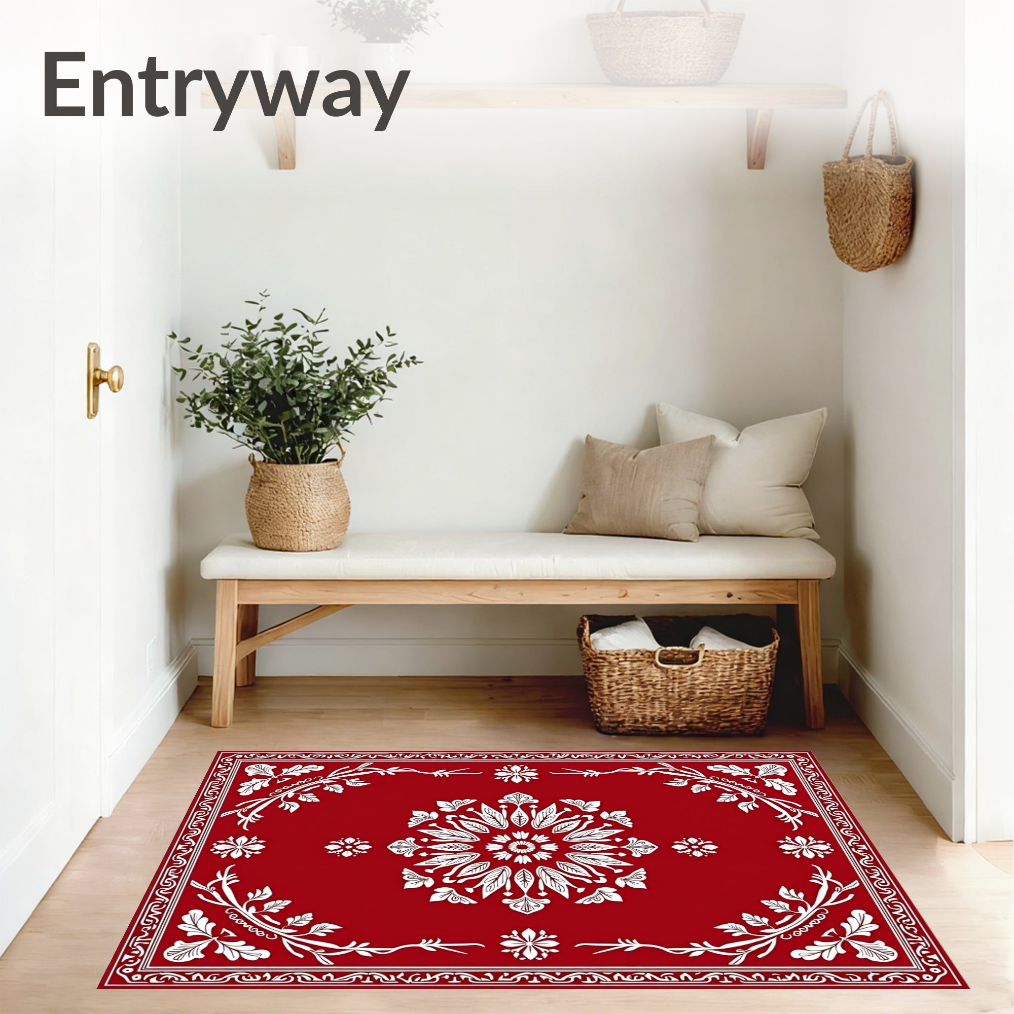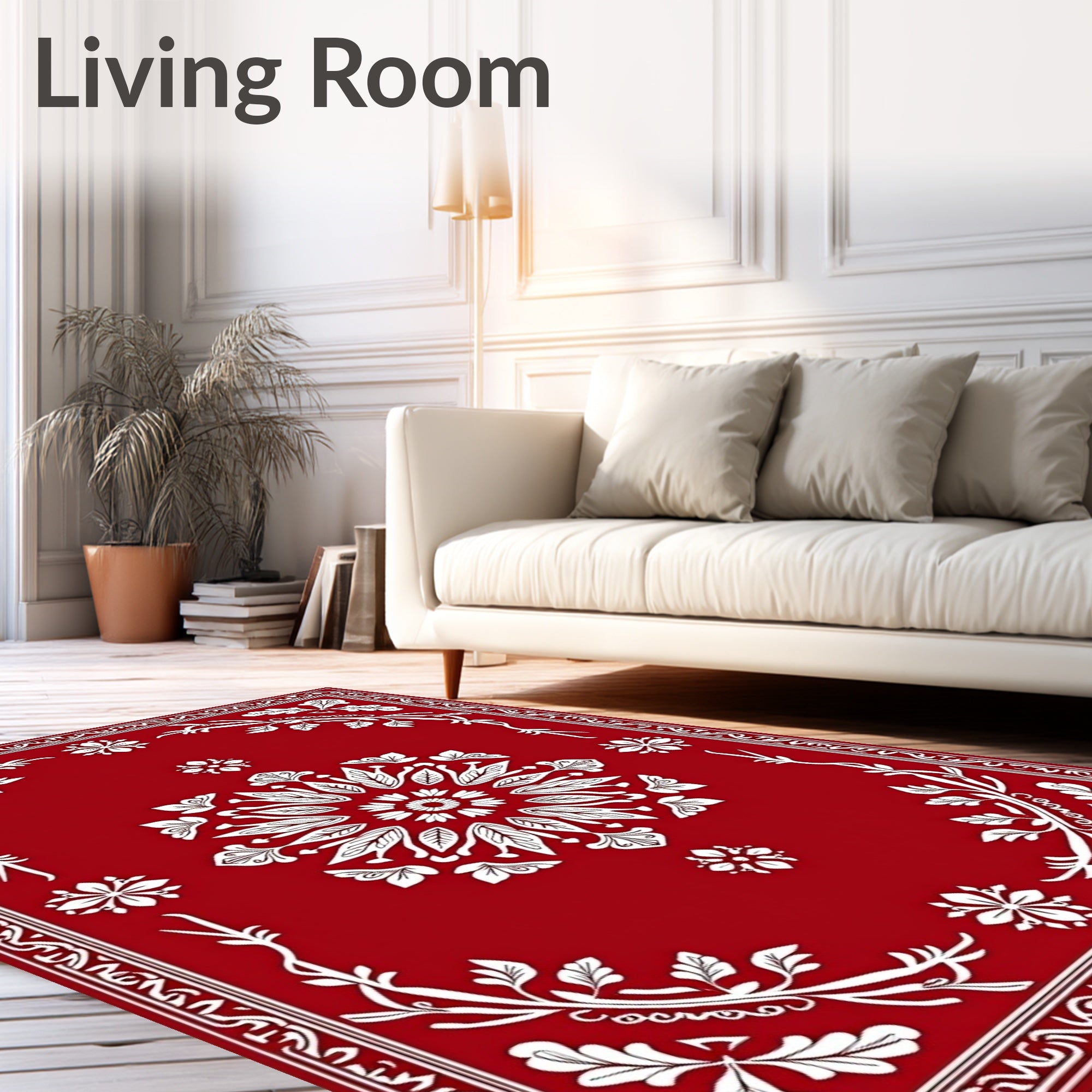Flatwoven High Traffic Area Rug, Baroque Floral Vine Arrangement with Symmetrical Petal Embellishments, Non Slip, Stain Resistant, Washable Area Rugs for Living Room, Bedroom (Red) Overview: