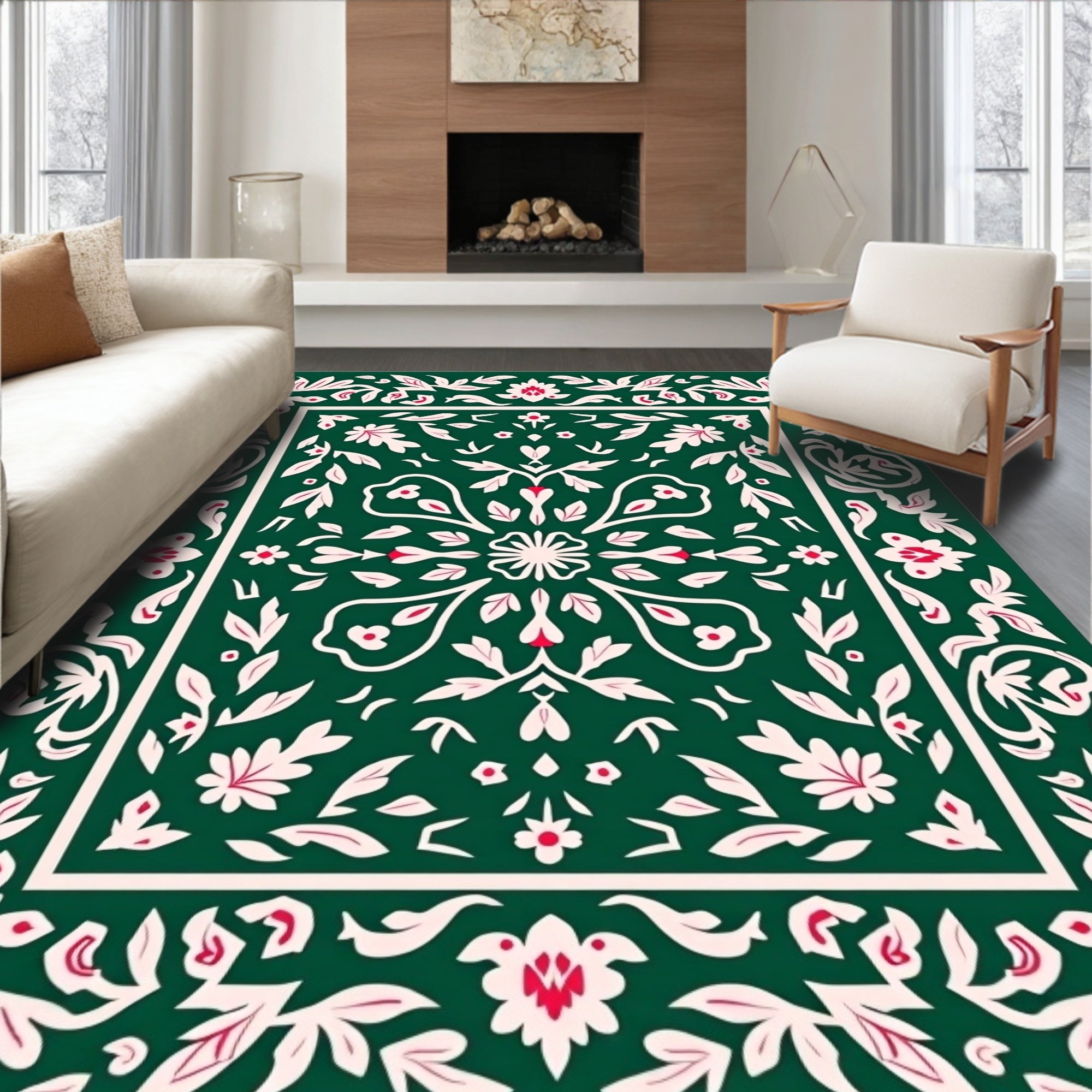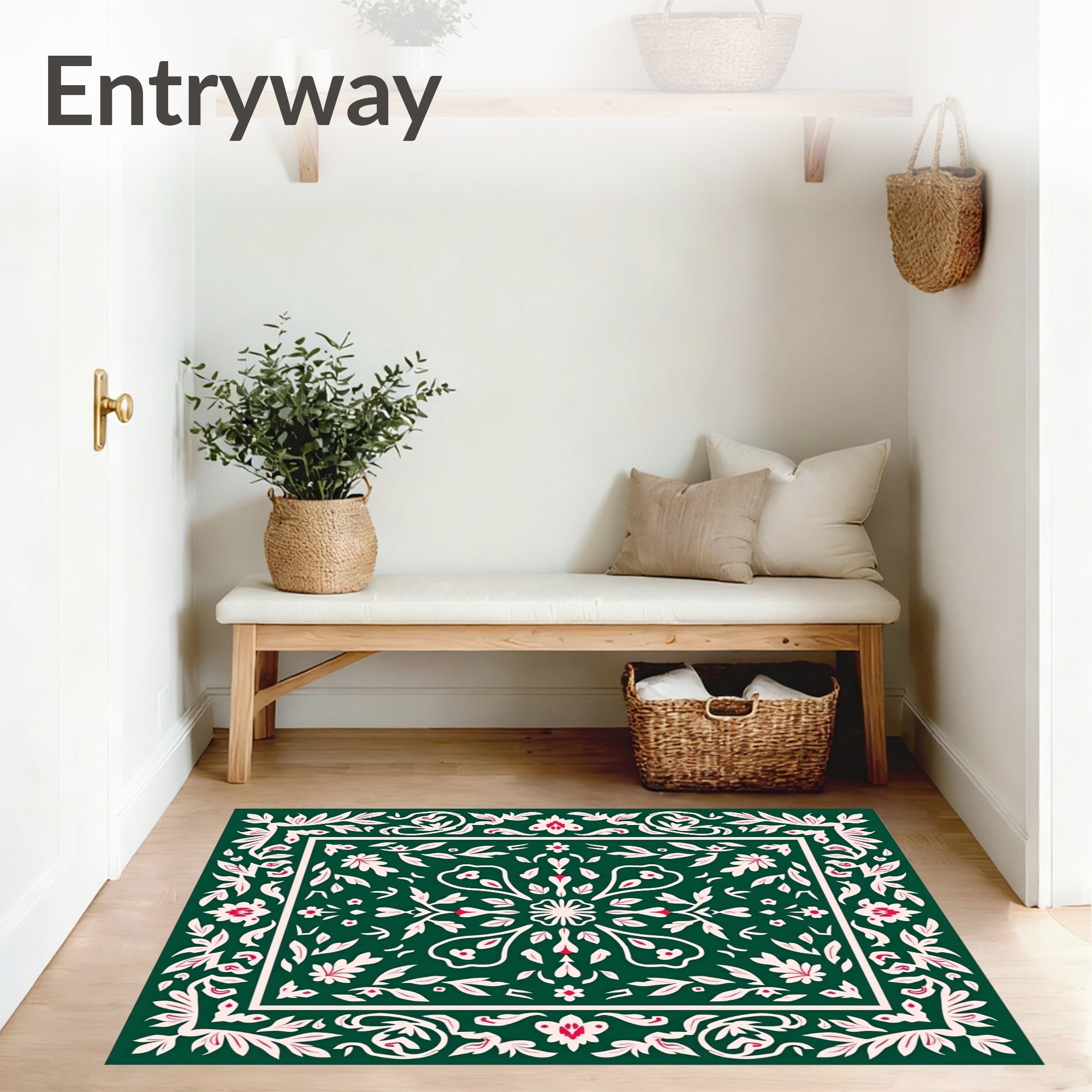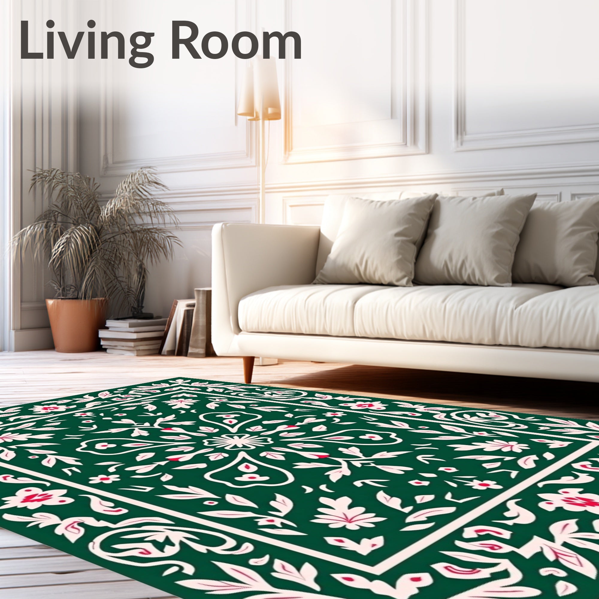 Flatwoven High Traffic Area Rug, Boho Meadow Featuring Stylized Petals and Interwoven Leaf Motifs, Non Slip, Stain Resistant, Washable Area Rugs for Living Room, Bedroom (Green) Overview: