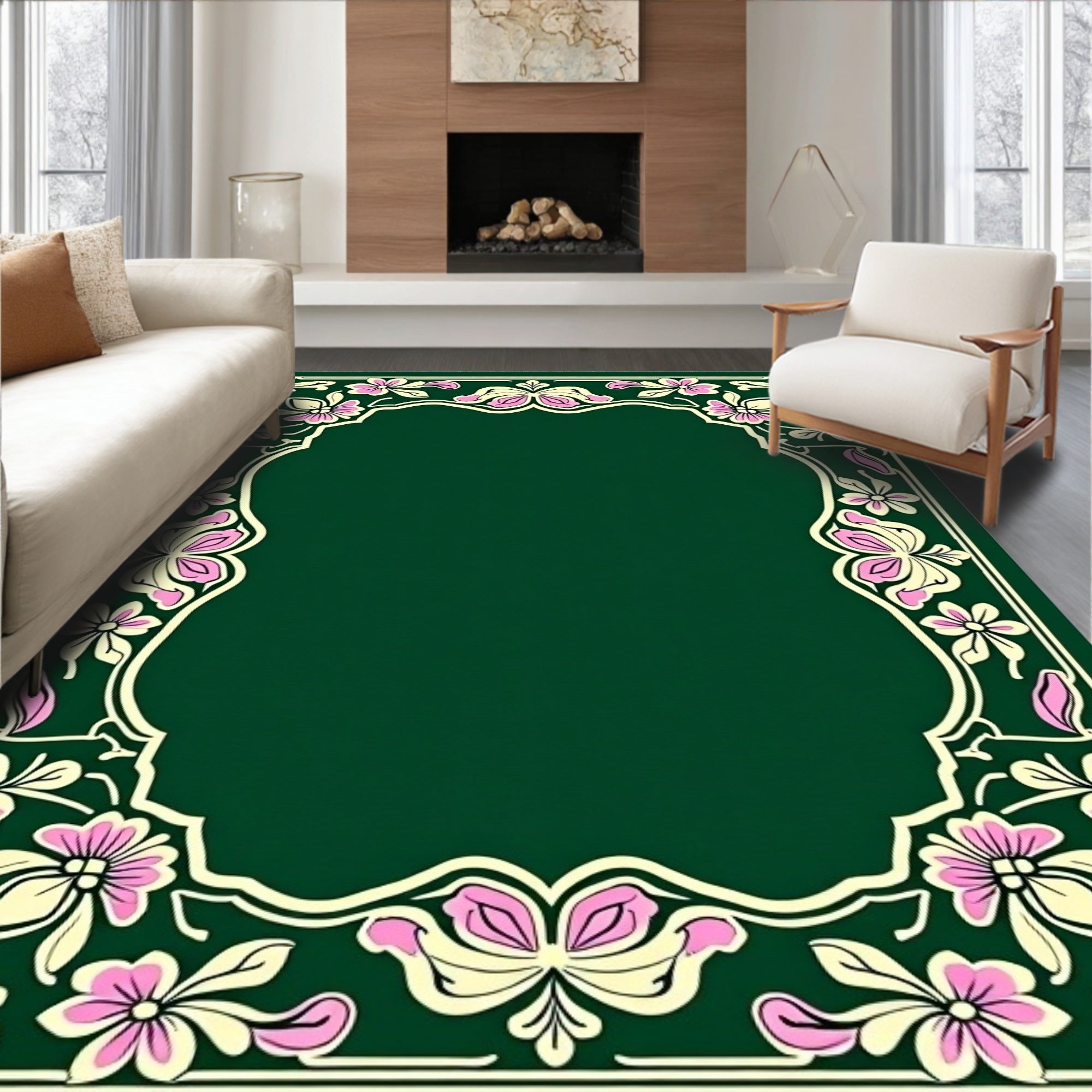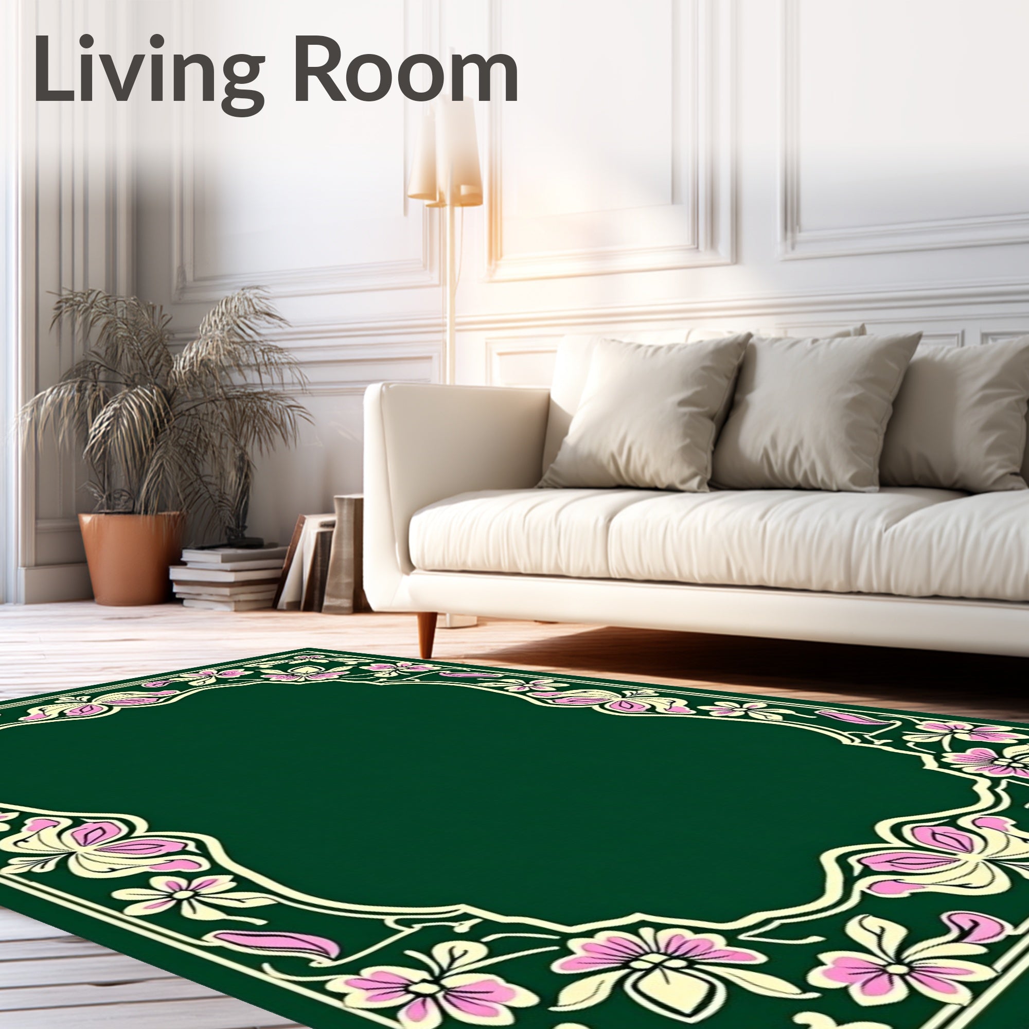 Flatwoven High Traffic Area Rug, Botanical with Edge Motif and Floral Accents, Non Slip, Stain Resistant, Washable Area Rugs for Living Room, Bedroom (Green) Overview: