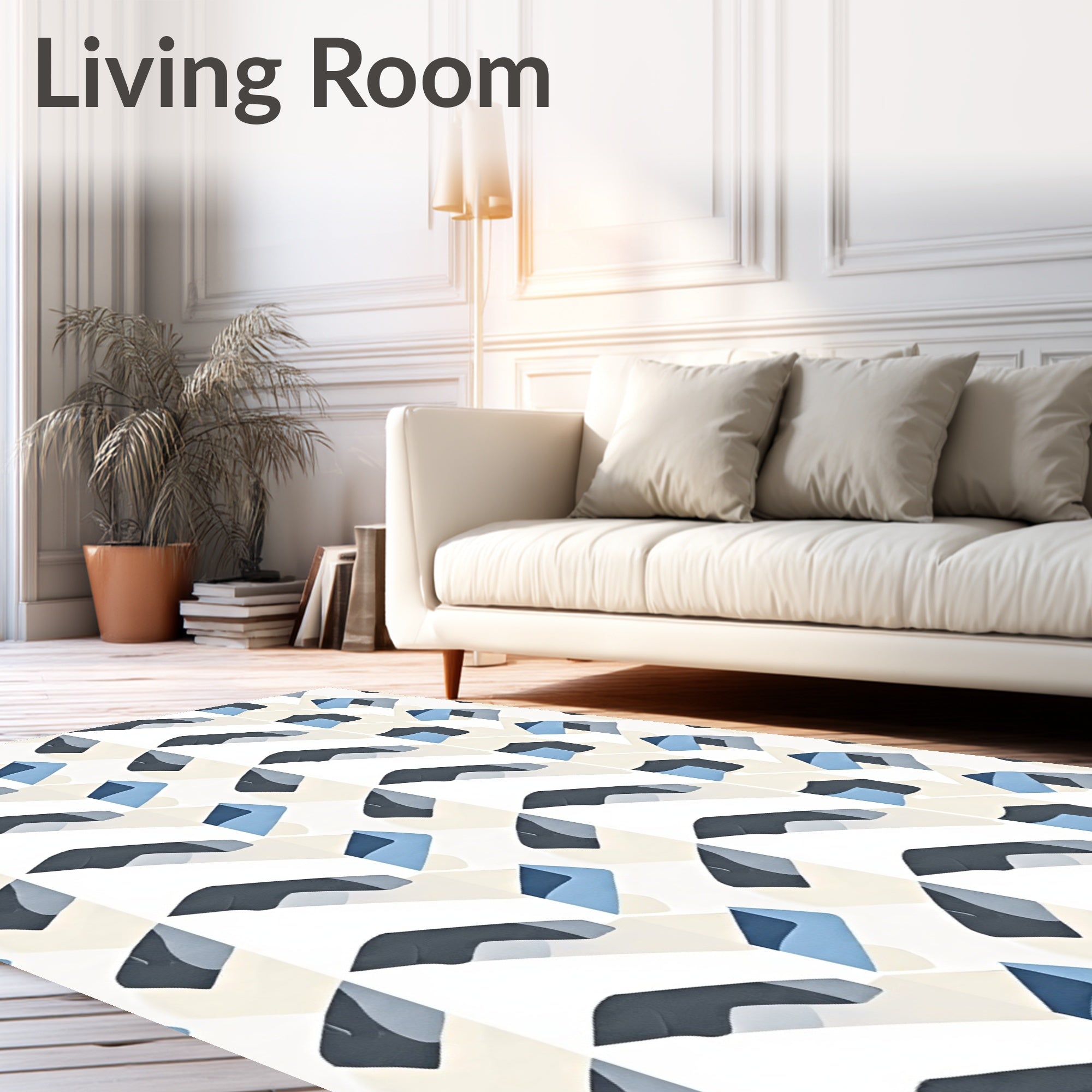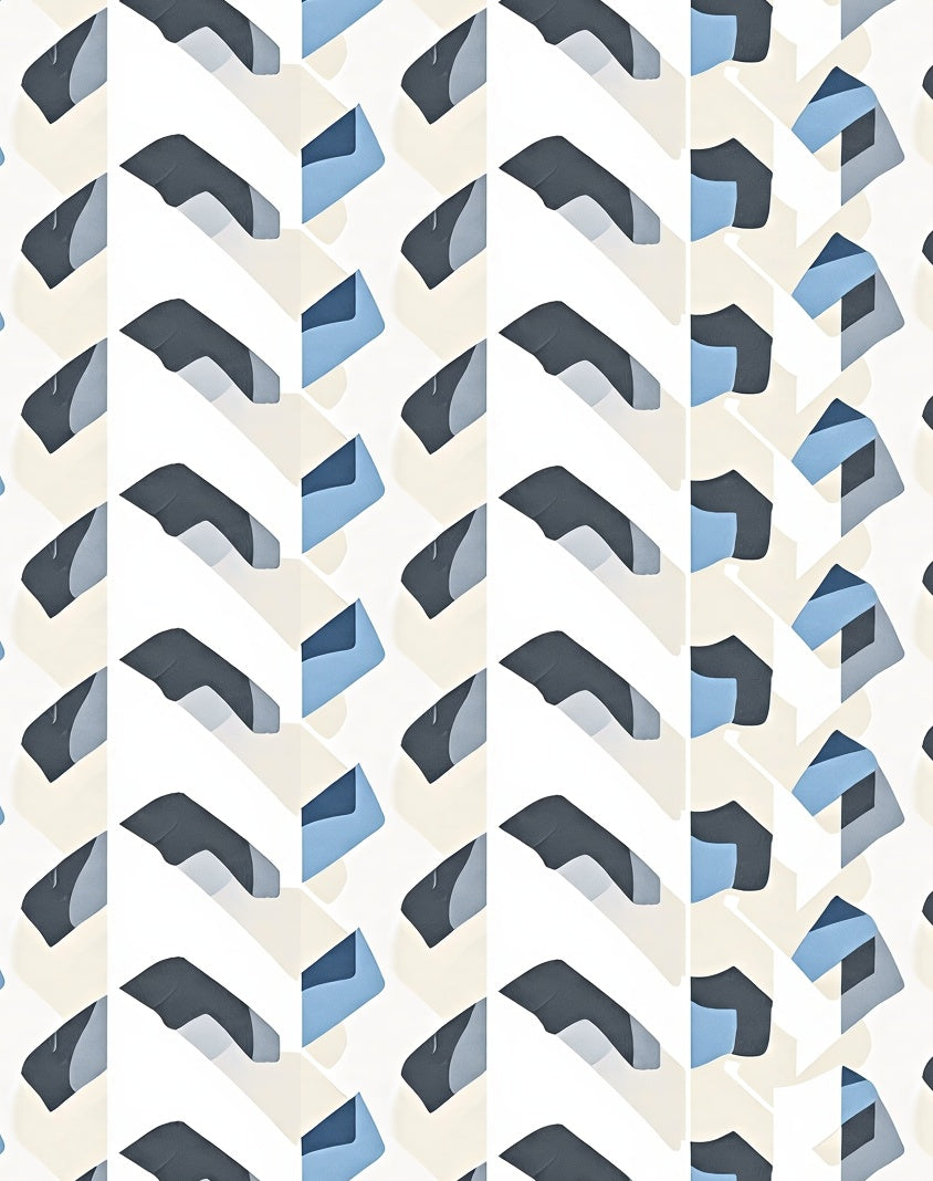 Drawing inspiration from the playful precision of the Bauhaus movement and the structural optimism of Midcentury California modernism, this design is a visual exploration of shadow and light. It reimagines the classic herringbone through the lens of Post-Digital Abstract art, where shapes fold and stack like origami in a dance of sky-kissed blues and midnight depths. The pattern does not merely sit upon the floor; it activates the room, turning flat surfaces into an interplay of rhythmic gradients and hard-edged elegance. Underneath your feet, the static atmosphere of a room dissolves into a curated gallery experience, where sunlight-drenched corners gain a new, sculptural purpose. This piece is crafted for the seeker of intentionality—the homebuilder who demands that their sanctuary be both a playground for the eyes and a vessel for calm. It is an invitation to move beyond the beige and anchor your life in a tableau of bold, structural poetry. Walk upon the future of form. Live in color.