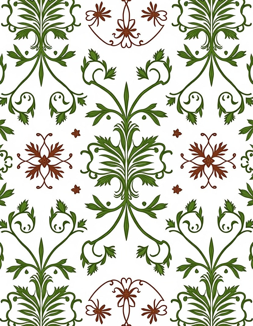 Classic Damask Floral with Symmetrical Leafy Scroll and Bloom (Green)