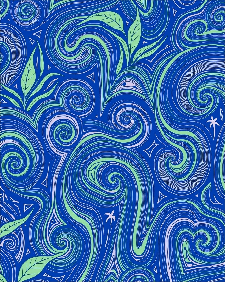 Curvilinear Wave Design Accented by Leafy Botanical (Blue)