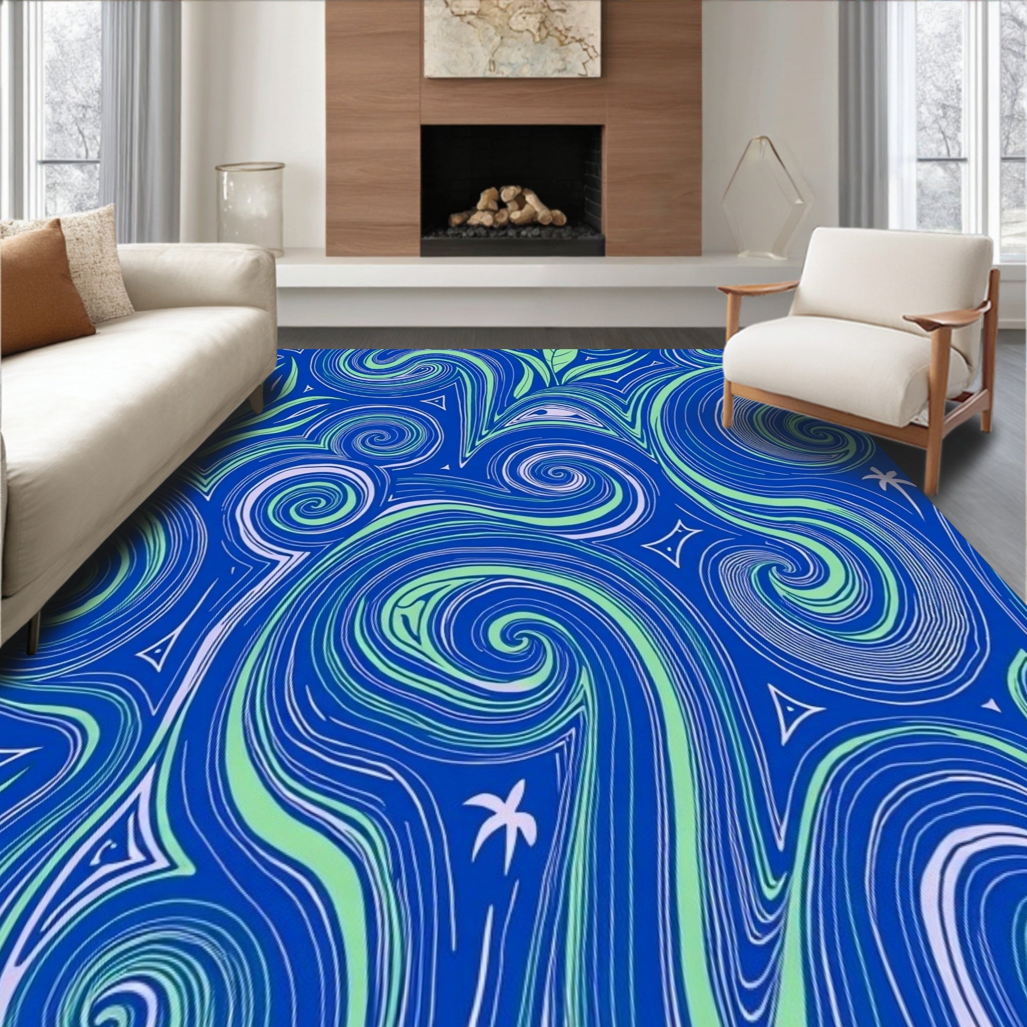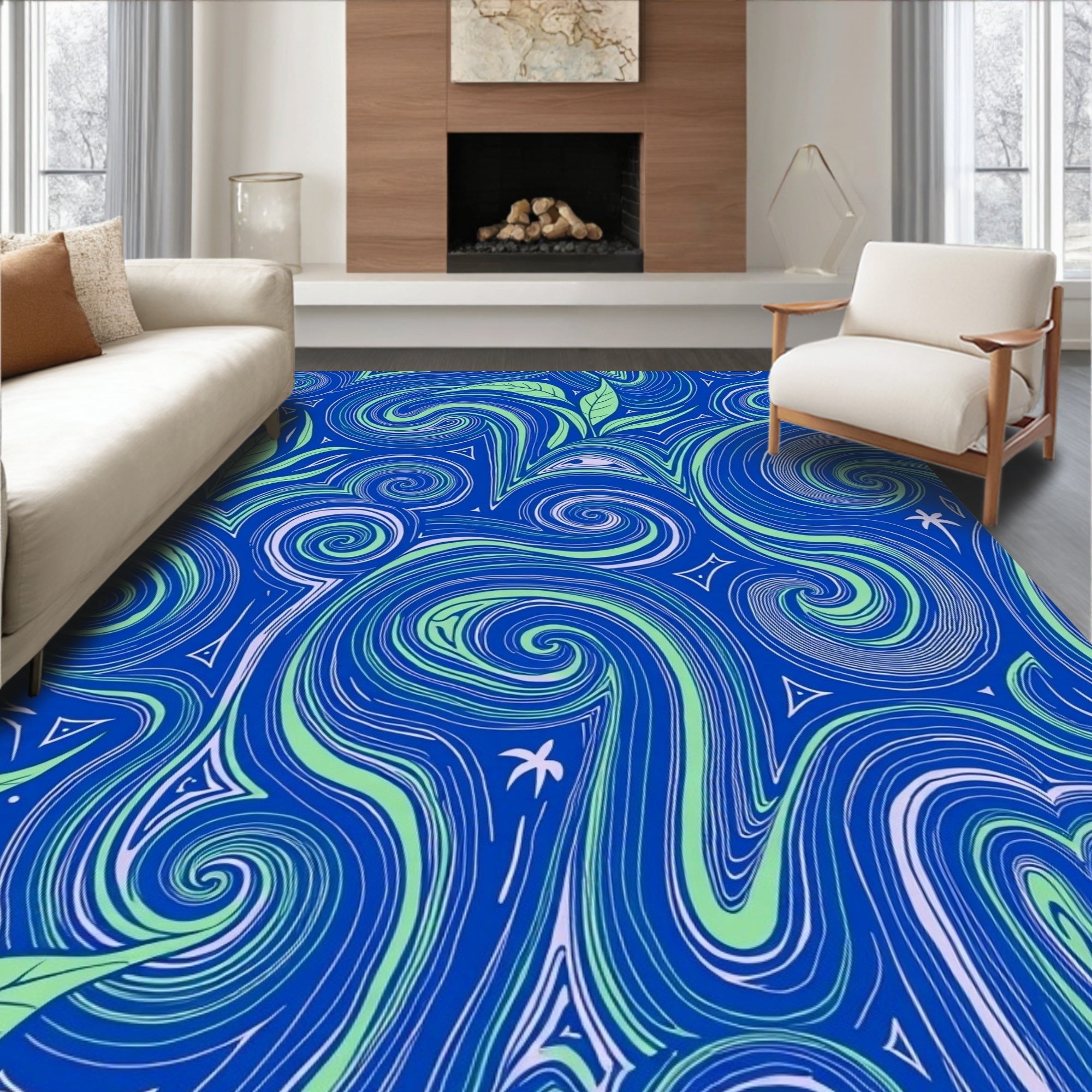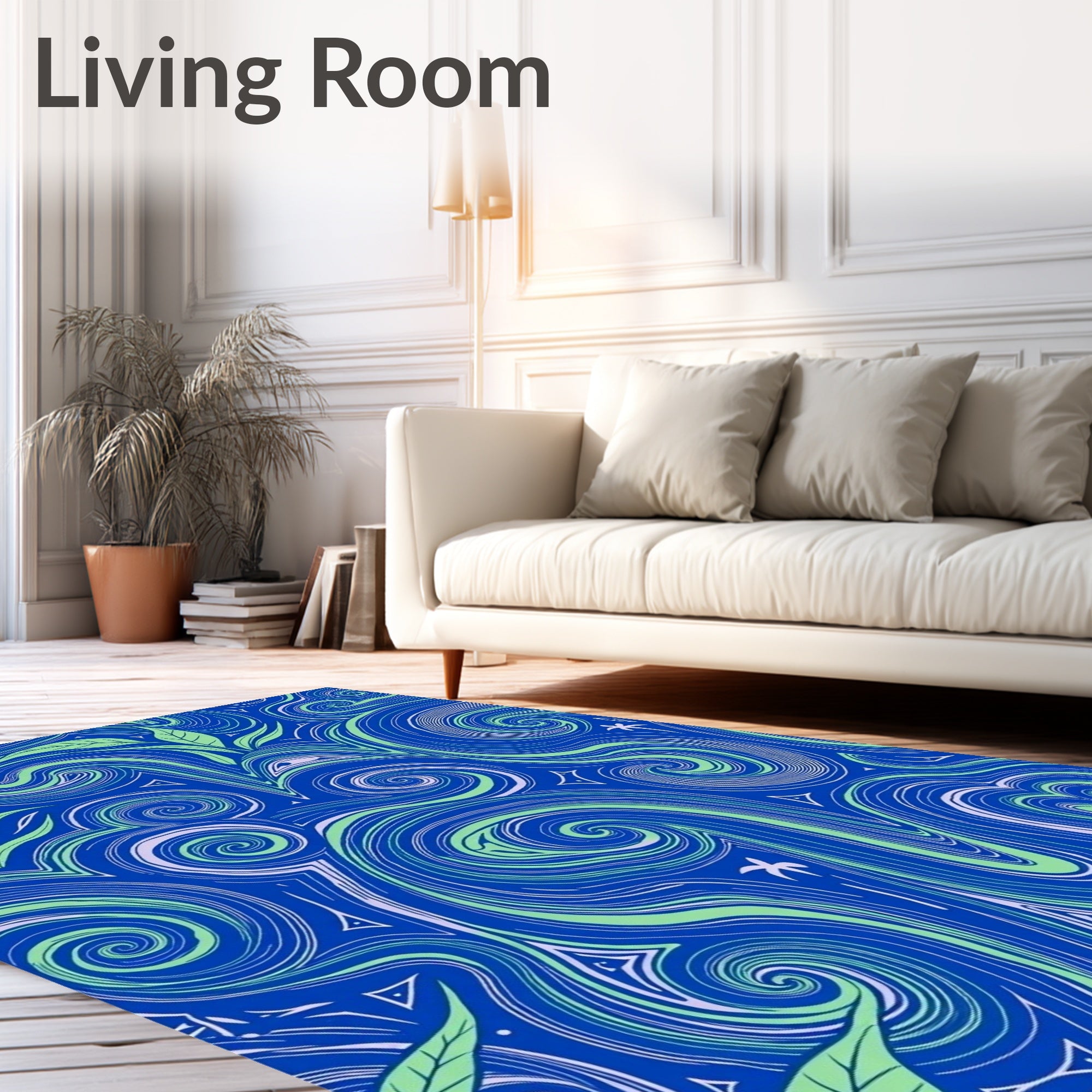 Flatwoven High Traffic Area Rug, Curvilinear Wave Design Accented by Leafy Botanical, Non Slip, Stain Resistant, Washable Area Rugs for Living Room, Bedroom (Blue) Overview: