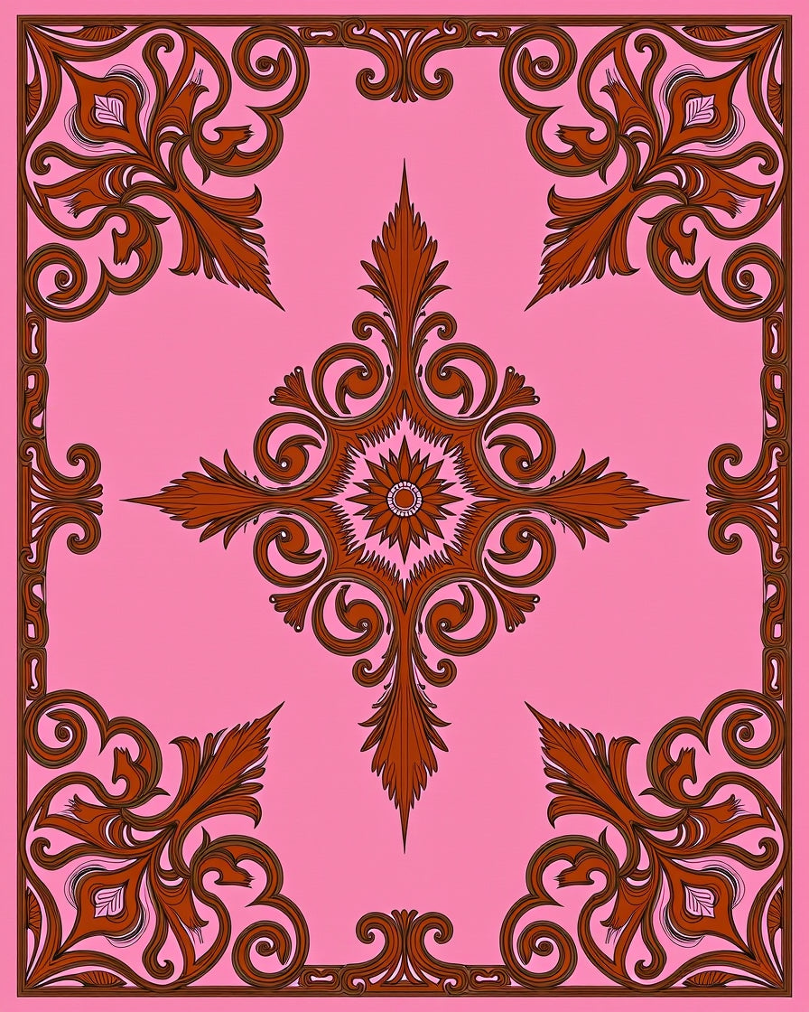 This design serves as a breathtaking bridge between the opulence of Victorian Baroque ornamentation and the spirited playfulness of the New Maximalist movement. It draws inspiration from the intricate scrollwork of 19th-century French textiles, reimagined through a bold, pop-art lens. The deep, cocoa-brown acanthus leaves curl like hand-tooled leather against a lush, bubblegum-pink expanse, creating a visual dialogue between grounded tradition and vibrant contemporary rebellion. As you enter the room, the atmosphere instantly warms; what was once a sterile floor transforms into a hallowed sanctuary of theater and charm. This is for the soul who refuses to settle for the mundane—the heart-led homebuilder who sees every corner as a canvas for self-expression. Don't just decorate your space; enchant it. Step onto this scene, and the world outside softens into a hushed, rose-tinted reverie. Walk upon poetry and live in color.
