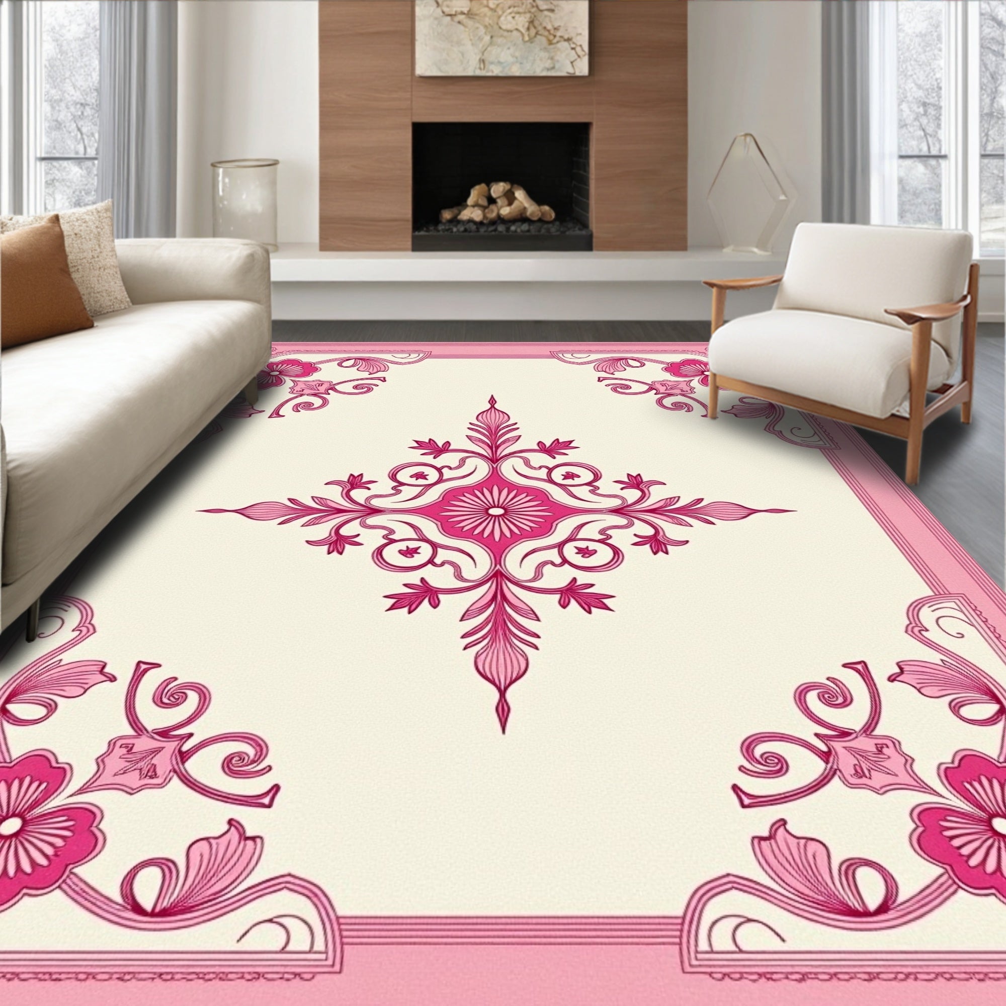 Flatwoven High Traffic Area Rug, Damask Motif with Romantic Rose Garden Accents, Non Slip, Stain Resistant, Washable Area Rugs for Living Room, Bedroom (Pink) Overview: