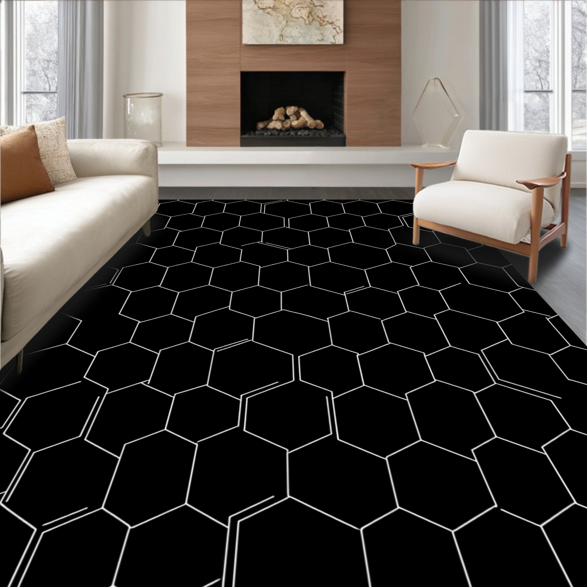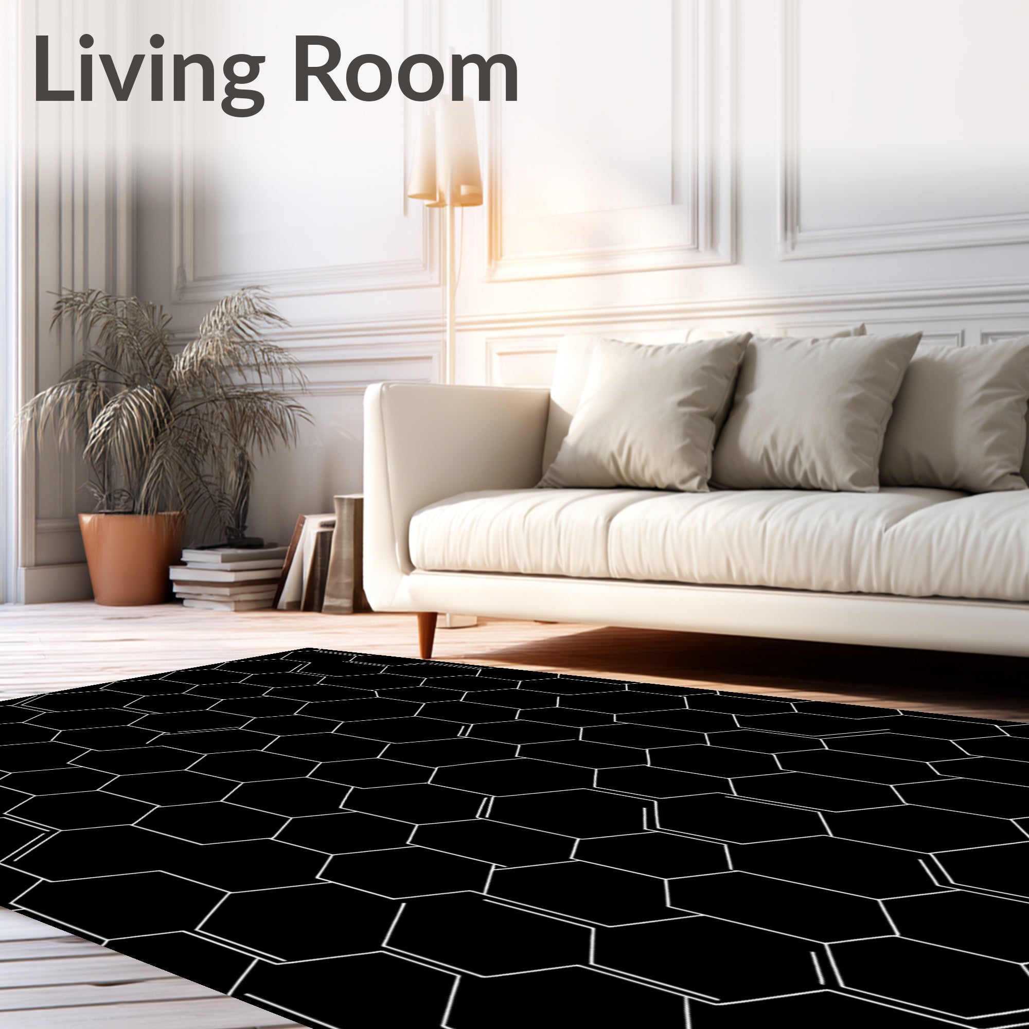 Flatwoven High Traffic Area Rug, Eclipse Hexagonal Grid With Interlocking Minimalist Symmetry, Non Slip, Stain Resistant, Washable Area Rugs for Living Room, Bedroom (Black) Overview: