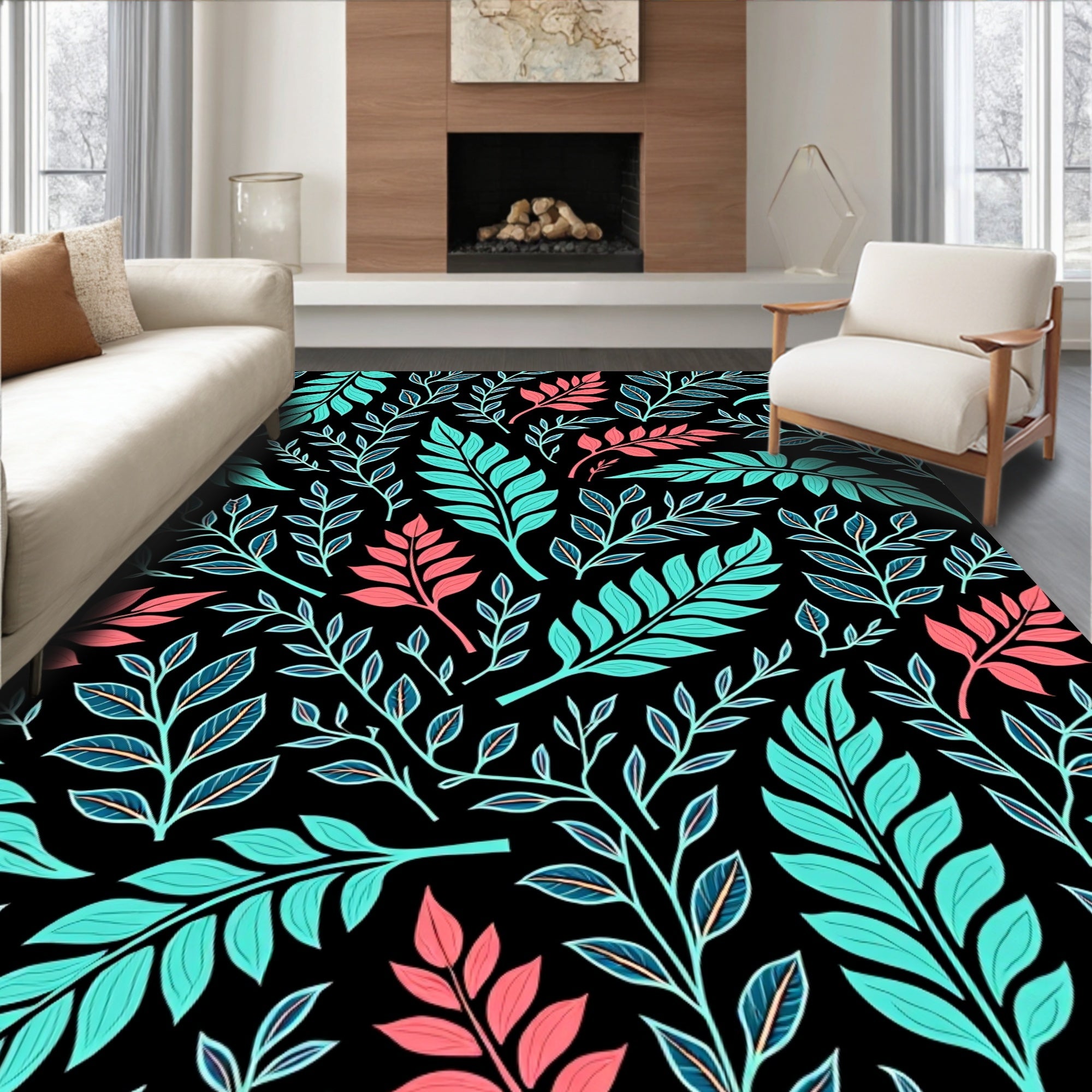 Flatwoven High Traffic Area Rug, Elegant Banana Fern Cascade Handpainted Floral Botanical Symphony, Non Slip, Stain Resistant, Washable Area Rugs for Living Room, Bedroom (Black) Overview: