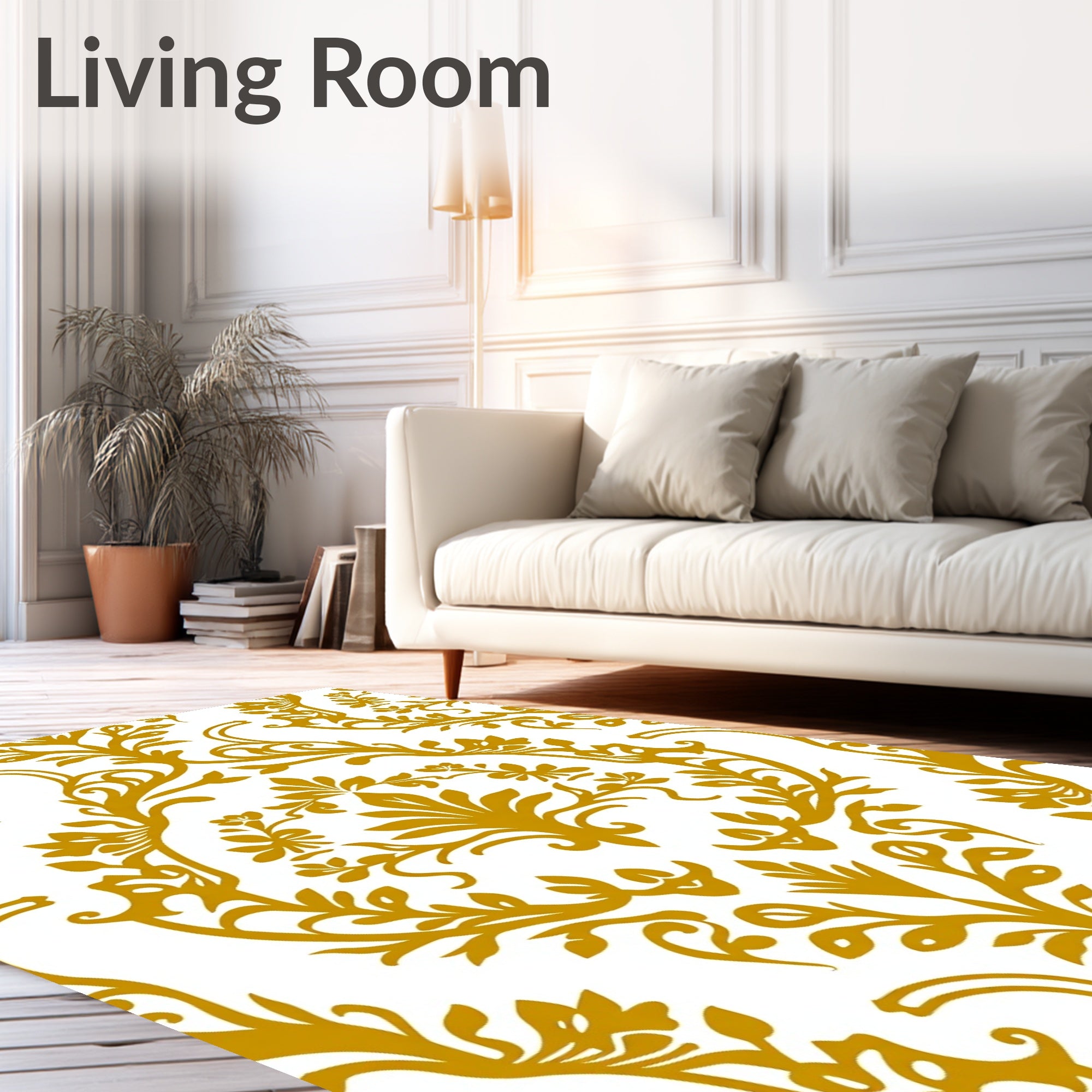 Elevate your home with the Golden Vintage Floral Damask Swirl Area Rug, a stunning blend of high-contrast traditional elegance and modern practicality. Featuring an intricate acanthus-leaf damask pattern in a sun-drenched gold hue against a crisp white field, this rug serves as a sophisticated focal point for any Living Room or bedroom. Crafted for longevity, its Durable construction is designed to withstand high-traffic patterns while maintaining a soft, low pile height that glides effortlessly under doors. This rug is Machine Washable and OEKO-TEX Standard 100 certified, ensuring it is as safe and eco-friendly as it is beautiful. Whether you need a small accent or a large statement piece, this versatile design offers a low-maintenance solution for a refined, timeless interior.
