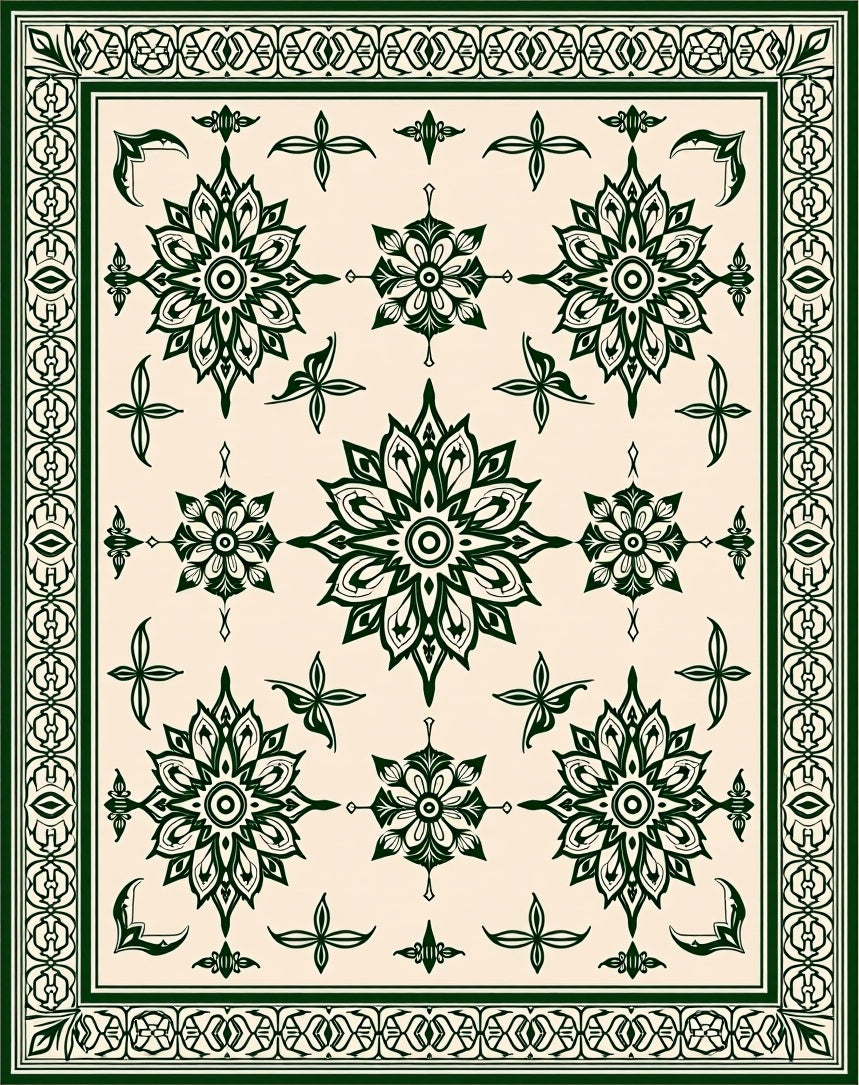 Infuse your home with the rhythmic elegance of our Emerald Green Floral Motif Area Rug. This piece features a striking symmetrical layout of botanic medallions set against a soft, cream-toned field, creating a sophisticated focal point for any Living Room or dining space. Its deep forest green border anchors the intricate pattern, lending a timeless Vintage appeal to both Modern and Traditional interiors. Crafted for longevity, this rug is exceptionally Durable and built to withstand the demands of high-traffic households. It is fully Machine Washable for easy maintenance and certified OEKO-TEX Standard 100, ensuring it is a safe and healthy addition to your living environment without compromising on its artisanal aesthetic.