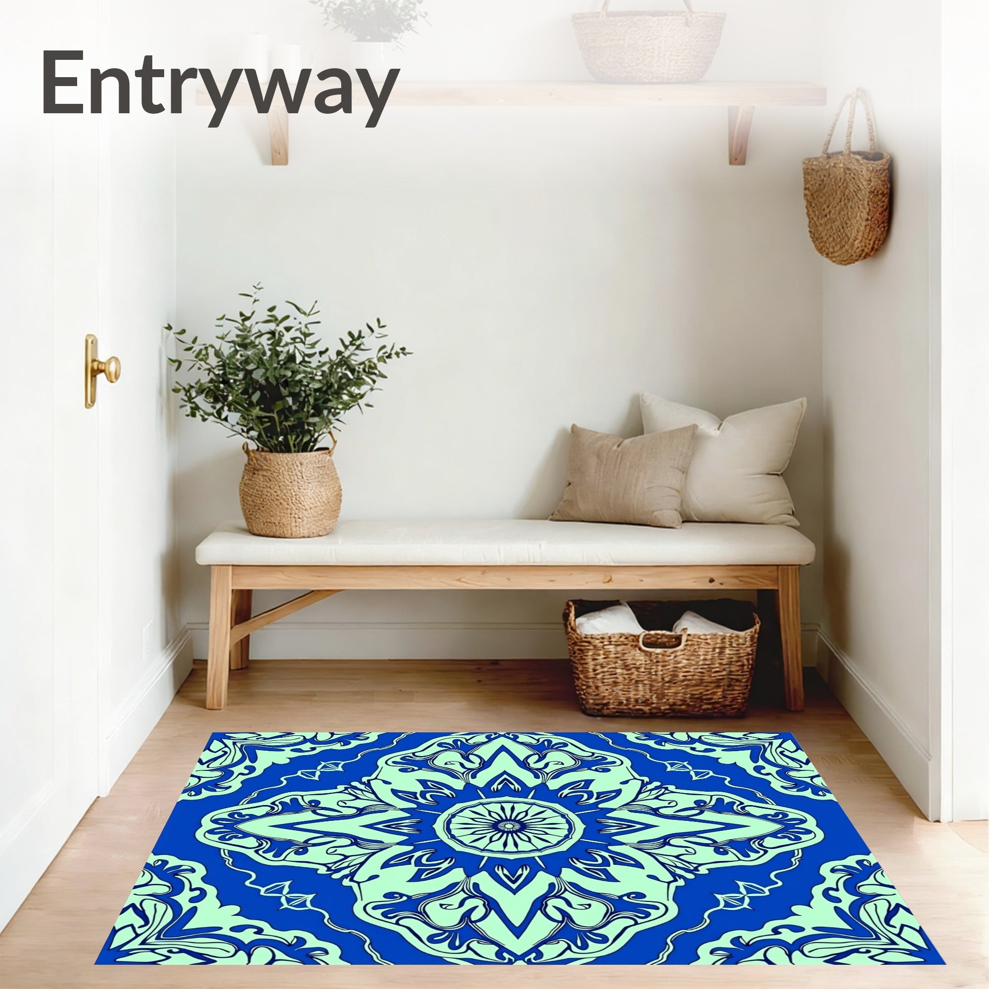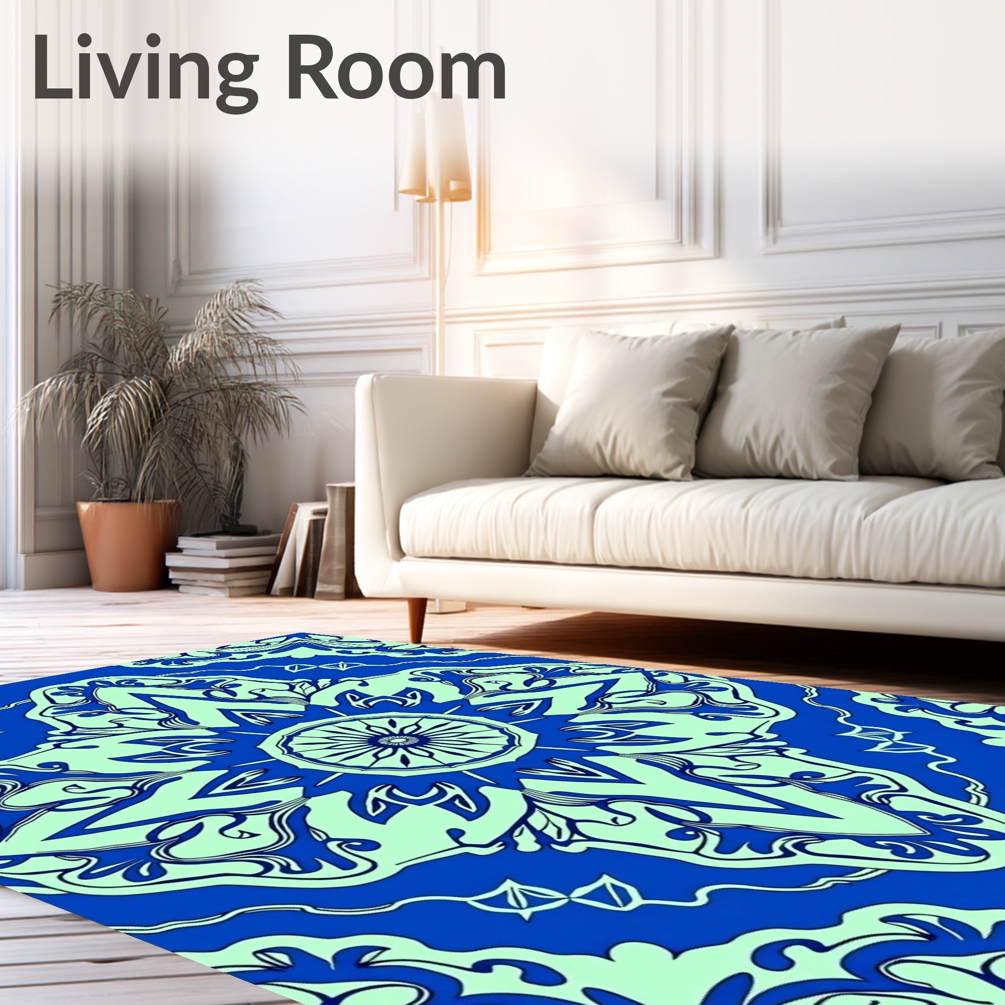 Flatwoven High Traffic Area Rug, Elegant Mediterranean Waves Medallion, Non Slip, Stain Resistant, Washable Area Rugs for Living Room, Bedroom (Blue) Overview: