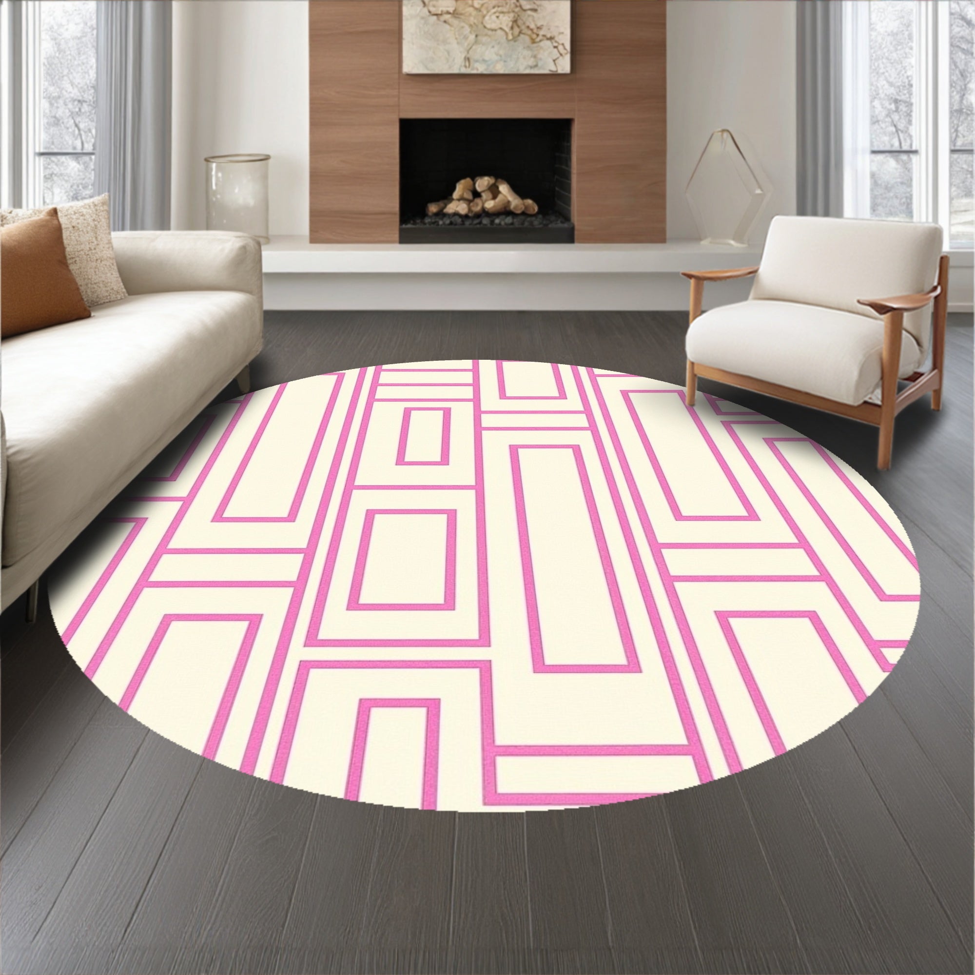 Drawing inspiration from the playful optimism of Midcentury Pop Art and the structured precision of De Stijl architecture, this rug is a visual celebration of form and rhythm. The shocking-pink lines pulse with a neon-light glow against a serene cream field, mimicking the rhythmic interlocking of urban scaffolding or the bold graphic energy of 1960s Palm Springs aesthetics. This is a design for the soul who refuses to blend into the background—the unapologetic color-lover who finds joy in sharp lines and electric hues. Step onto this canvas, and the room instantly awakens; the air feels lighter, the walls hum with kinetic energy, and ordinary floorboards are transformed into a gallery-worthy installation. It is a declaration of confidence for the spirit that believes a home should be as vivid and expressive as a heartbeat. Walk upon energy. Live in color.