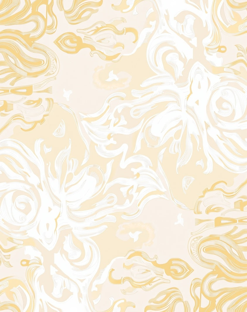 This design is a visual ode stretching from the intricate botanical illustrations of Art Nouveau to modern Californian minimalism. It captures the essence of a 'Neo-Gilded Age'—where opulence is redefined through softness and light rather than weight and stone. The motifs swirl like sun-honeyed silk, with abstract petals blooming defiantly in a field of hushed champagne tones. As you lay this piece down, the room undergoes a quiet metamorphosis: the floor becomes a pool of liquid amber, and hard corners seem to dissolve into rhythmic, organic lines. This is a design crafted for the seeker of slow joy, for the heart-led homebuilder who believes that every morning should feel like a salt-kissed sunrise. It is not merely an accessory; it is a portal to a more graceful way of living. Step onto this scene and feel the pulse of the room soften into a hallowed, golden stillness. Walk upon poetry. Live in reverence.