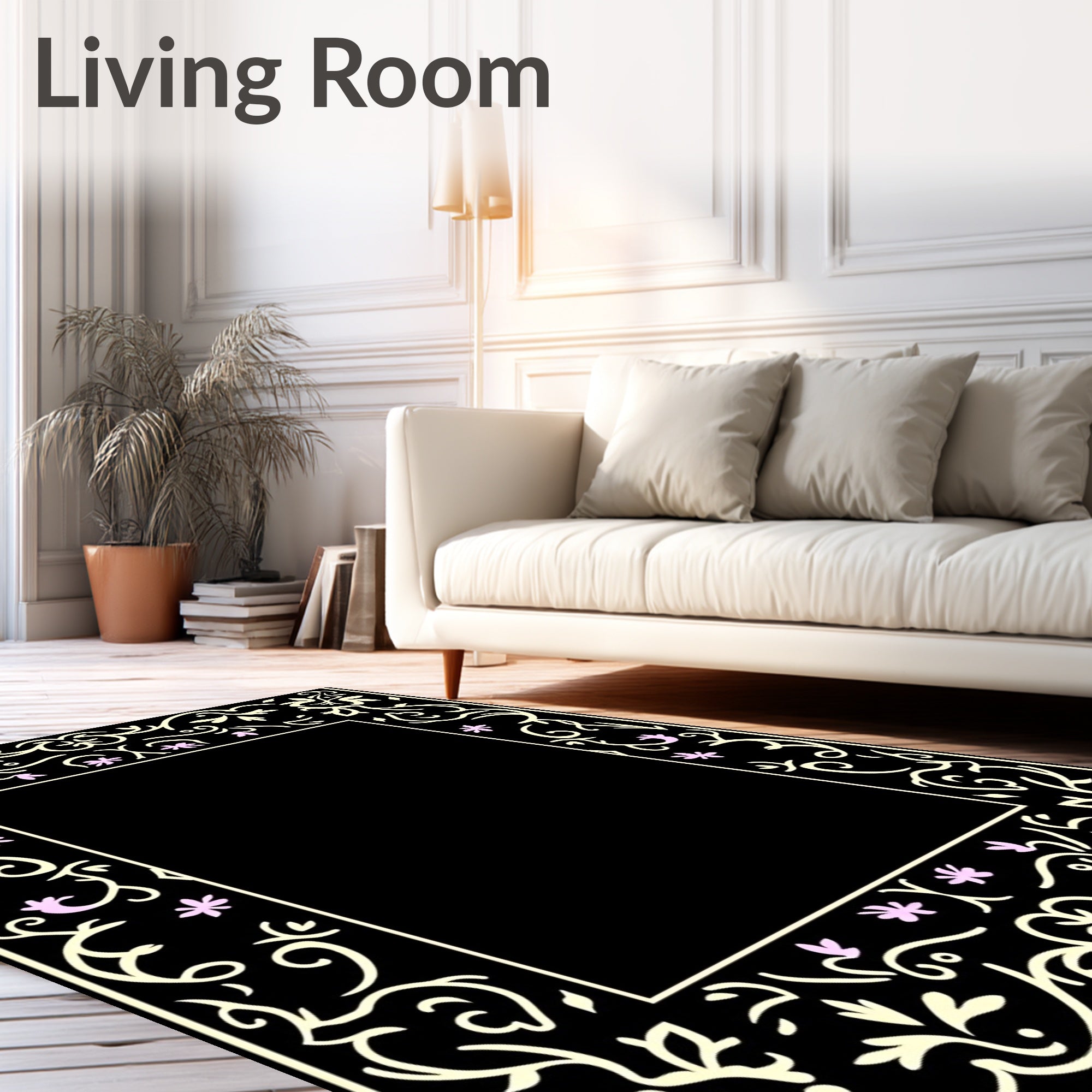 Flatwoven High Traffic Area Rug, Fairy Tale Blossom Swirl with Delicate Bug Ornamentation, Non Slip, Stain Resistant, Washable Area Rugs for Living Room, Bedroom (Black) Overview: