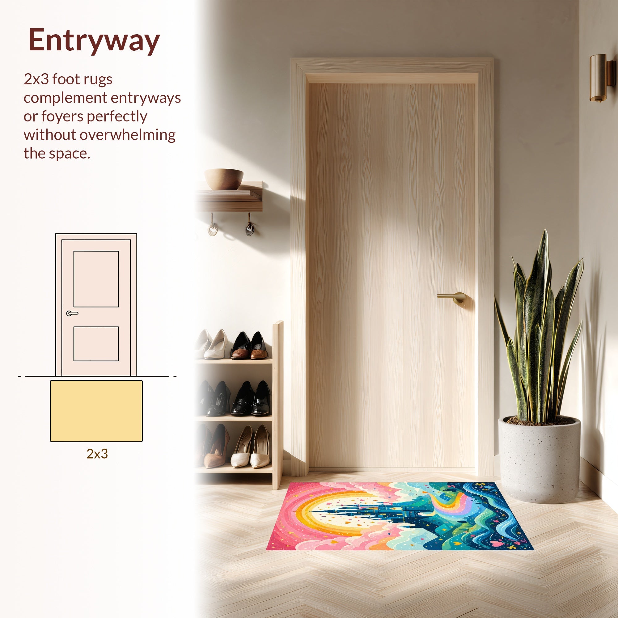 Flatwoven High Traffic Area Rug, Fairy Tale Castle Silhouette Surrounded by Swirling Rainbow Waves, Non Slip, Stain Resistant, Washable Area Rugs for Living Room, Bedroom (Pink) Overview: