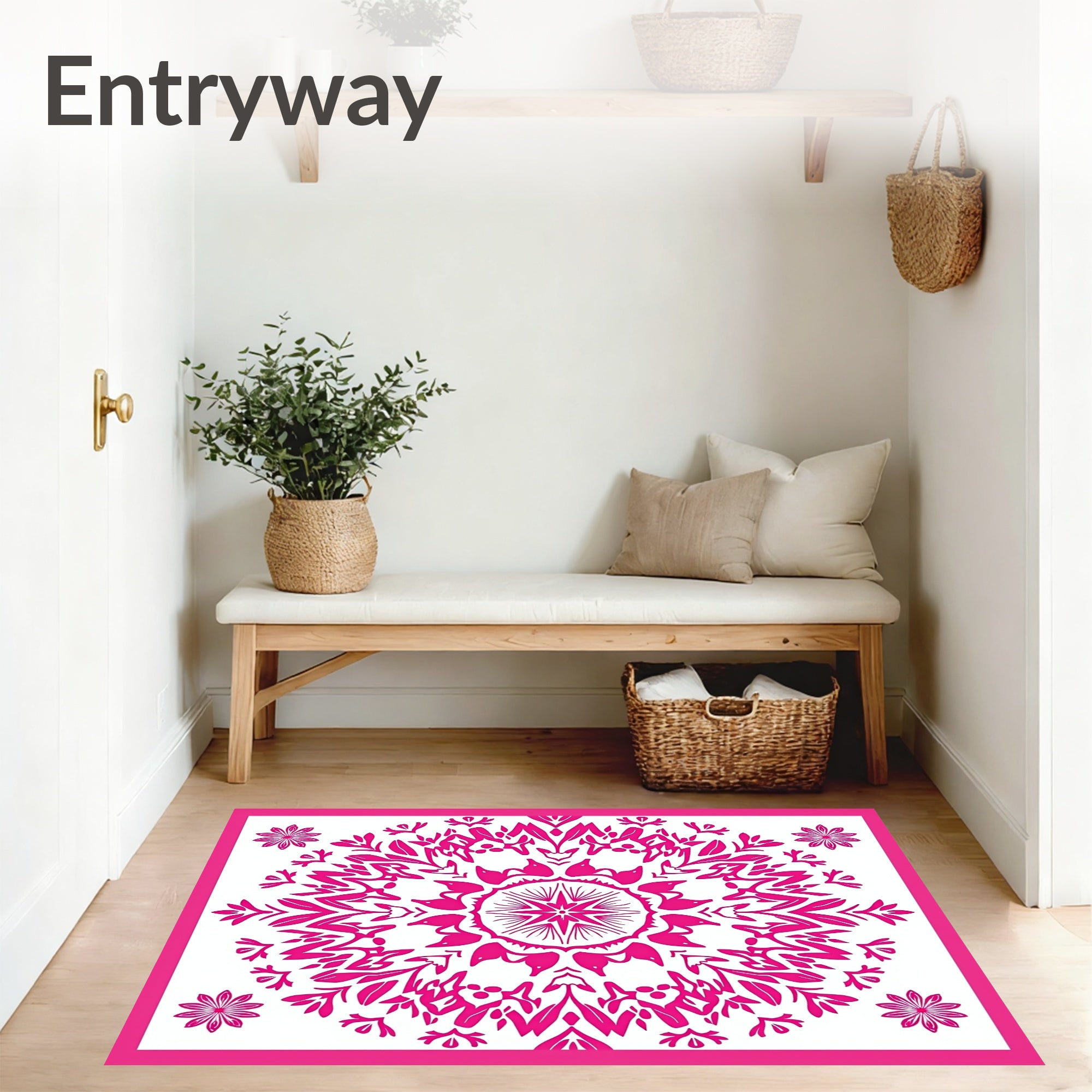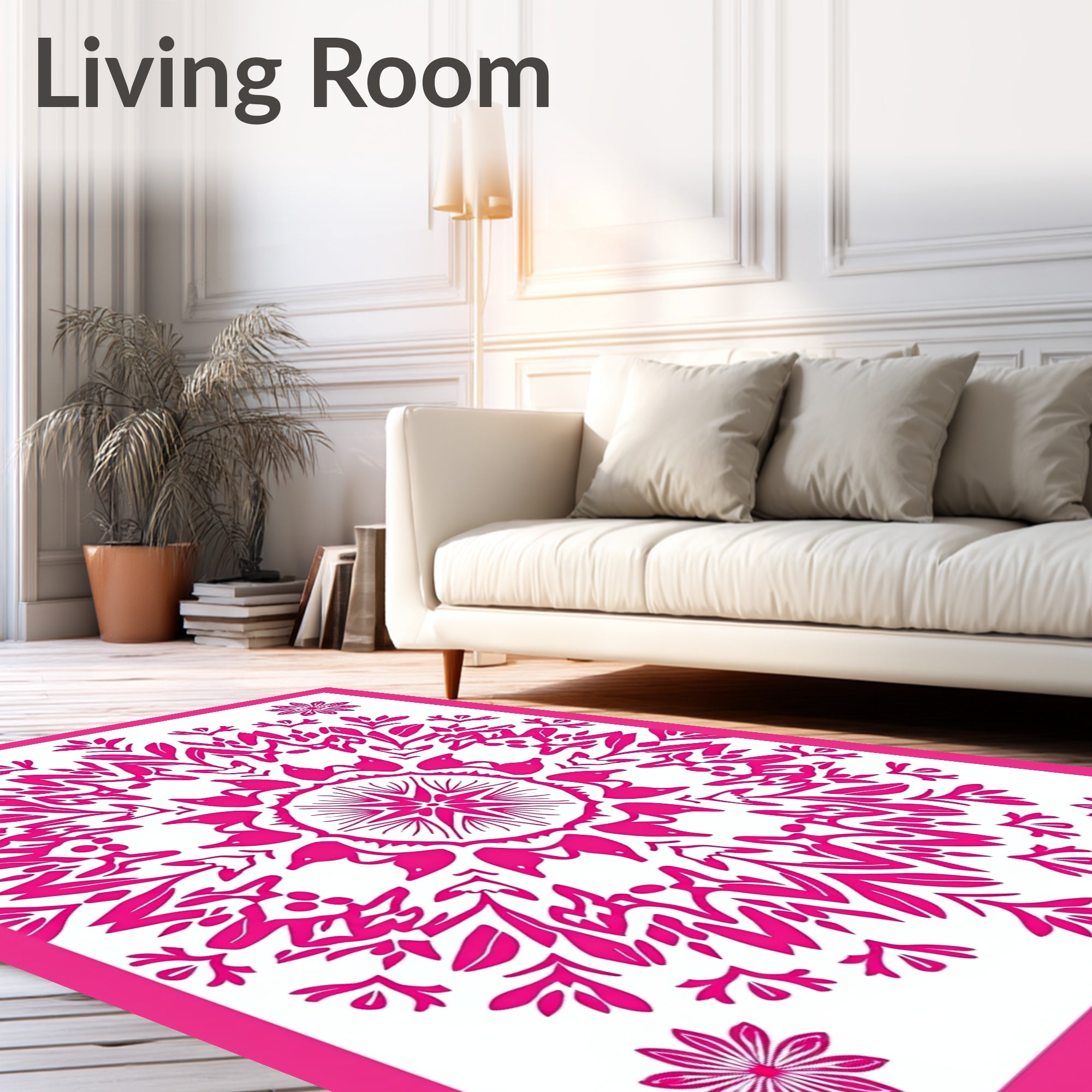 Flatwoven High Traffic Area Rug, Floral Burst Design with Ornate Center Rosette, Non Slip, Stain Resistant, Washable Area Rugs for Living Room, Bedroom (Pink) Overview: