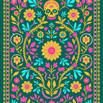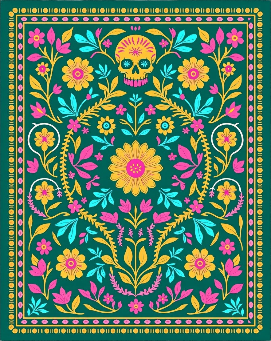 Folk Art Floral Skull with Lively Botanical Embellishments (Green)