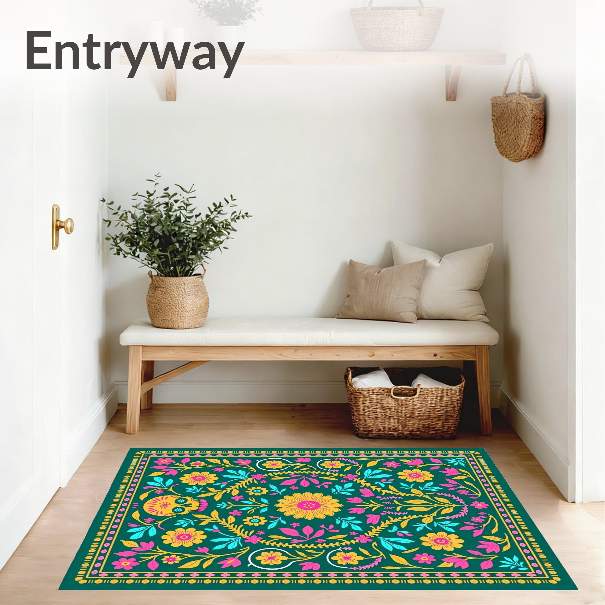 Flatwoven High Traffic Area Rug, Folk Art Floral Skull with Lively Botanical Embellishments, Non Slip, Stain Resistant, Washable Area Rugs for Living Room, Bedroom (Green) Overview: