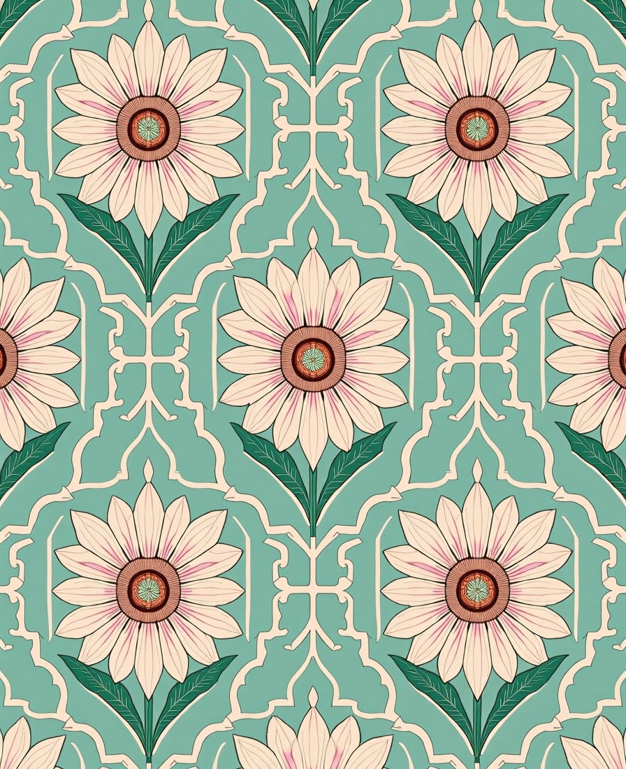 Intricate Sage Green and Blush Floral Lattice with Sunflower Details (Teal)