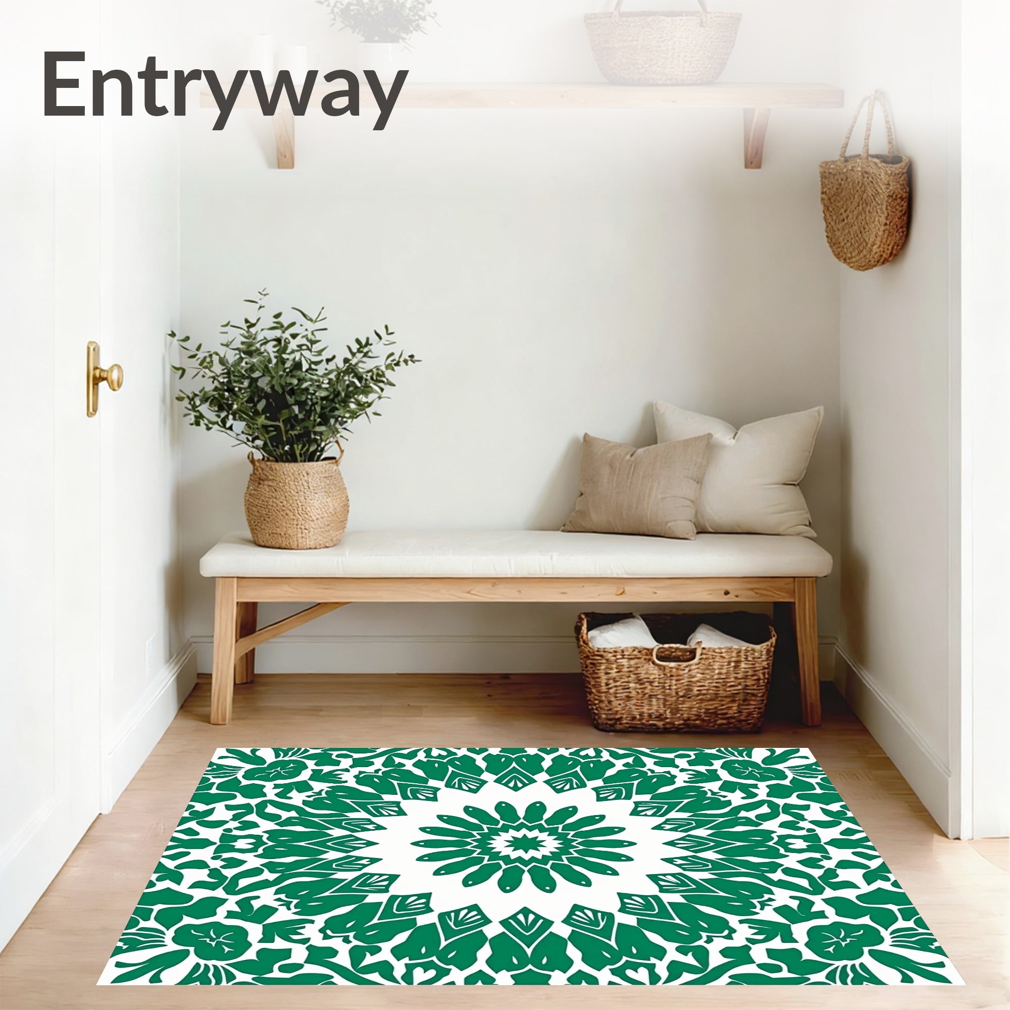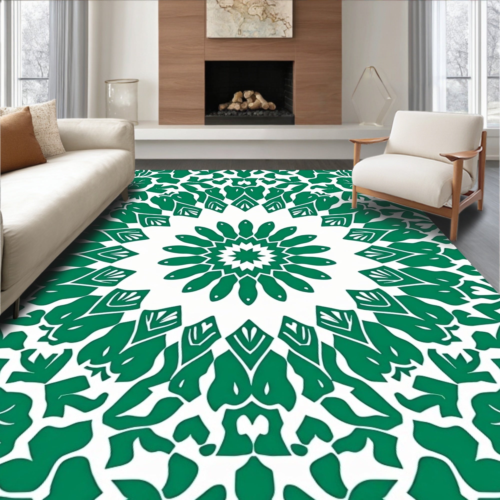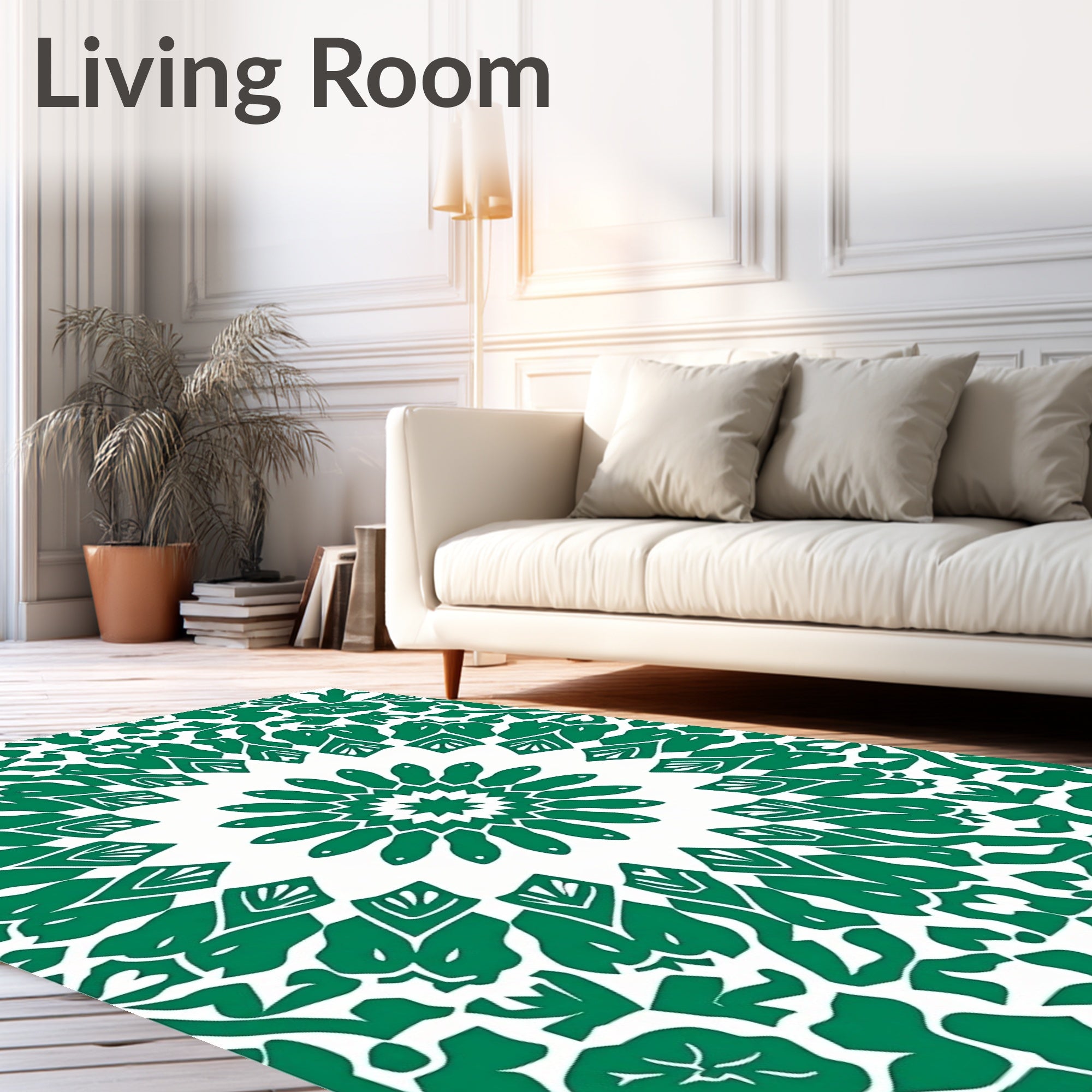 Flatwoven High Traffic Area Rug, Kaleidoscope with Symmetrical Botanical, Non Slip, Stain Resistant, Washable Area Rugs for Living Room, Bedroom (Green) Overview: