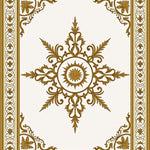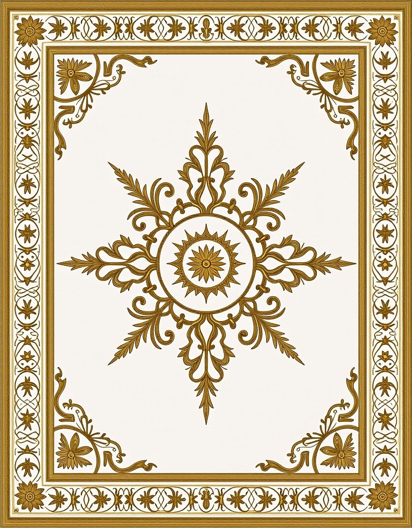 Born from the gilded opulence of the Beaux-Arts movement and the intricate linework of Neo-Classical bookbinding, this rug is a visual ode to the age of symmetry. Its central starburst radiates outward like a sun-kissed compass, anchored by acanthus-leaf flourishes that whisper of hallowed European libraries and sun-drenched palazzos. The interaction between the crisp cream field and the amber-gold filigree creates a rhythmic dance of light and shadow, turning your floor into a grand tableau of architectural precision. Step onto this scene, and the room shifts: modern edges soften into a timeless, hushed elegance. It is designed for the seeker of quiet drama and the heart-led homebuilder who believes that everyday spaces deserve a touch of the sacred. This is not merely a floor covering—it is a declaration of reverence for craftsmanship. Walk upon poetry and let your home become an anchor of golden serenity.