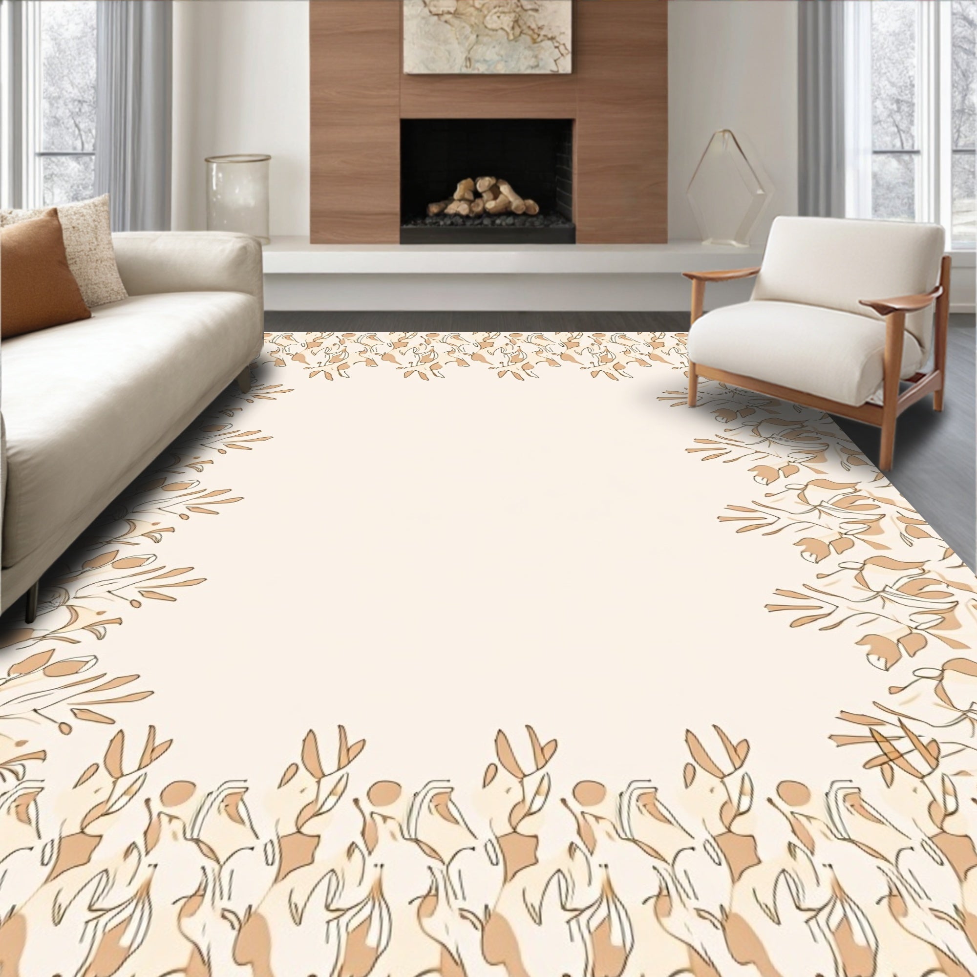 Drawing inspiration from the effortless grace of Matisse’s late-period botanical sketches and the light-suffused minimalism of Scandinavian floral compositions, this design is a visual ode to the quiet beauty of a sun-drenched garden. The peach-toned leaves and fine-spun lines dance toward the center, framing your furniture like a piece of curated art. It is a modern reclamation of the traditional border rug, replacing heavy ornamentation with rhythmic, salt-kissed strokes that breathe with a contemporary lightness. Step onto this scene, and the room shifts: hard edges soften, ceiling lights mimic a dappled canopy glow, and the bustle of the outside world fades into a hushed, serene stillness. This rug is for the heart-led homebuilder who believes magic belongs in the quiet moments of daily life—the seeker of slow joy and morning light. Don't just fill your space—anchor it in poetry and live in reverence.