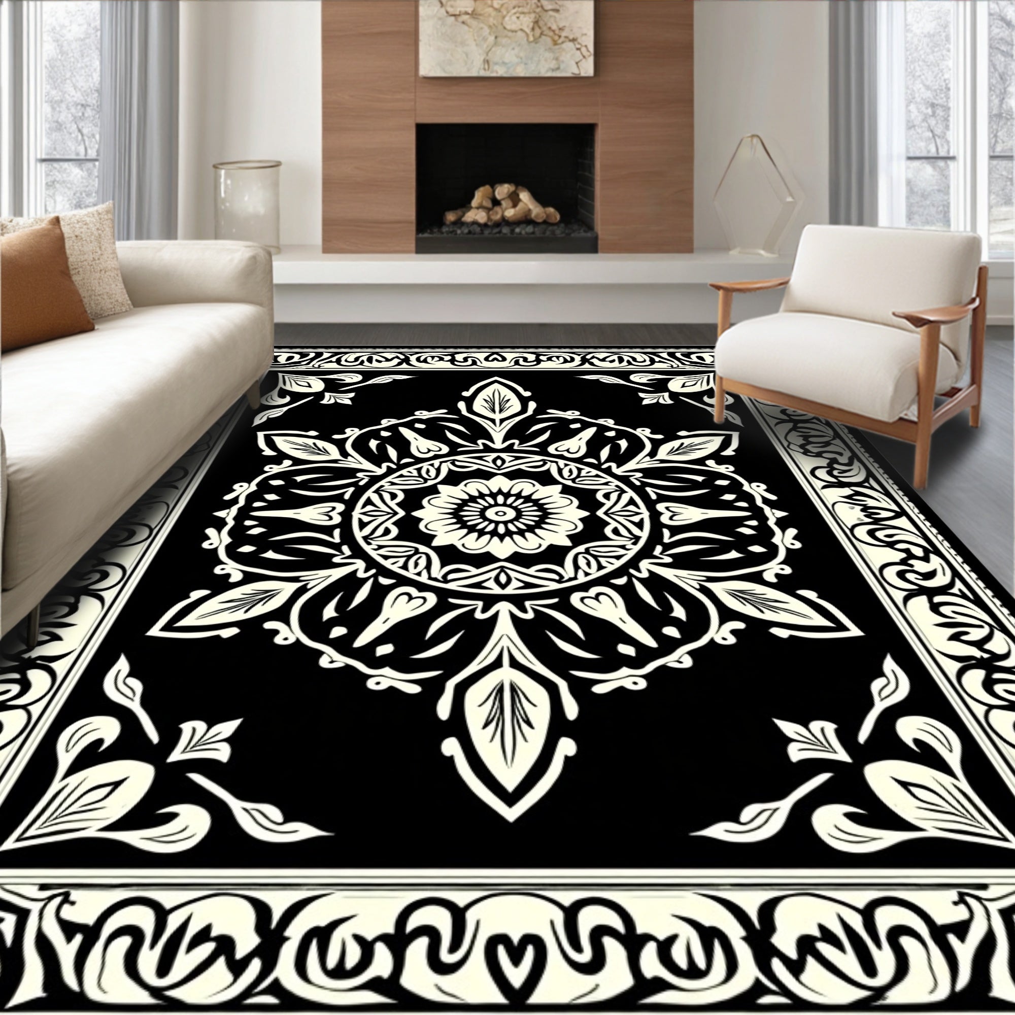 Flatwoven High Traffic Area Rug, Medallion with Swirling Paisley Accents, Non Slip, Stain Resistant, Washable Area Rugs for Living Room, Bedroom (Black) Overview: