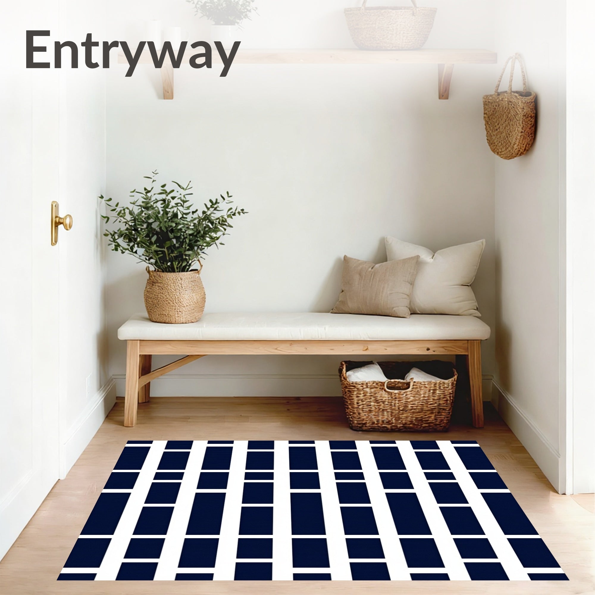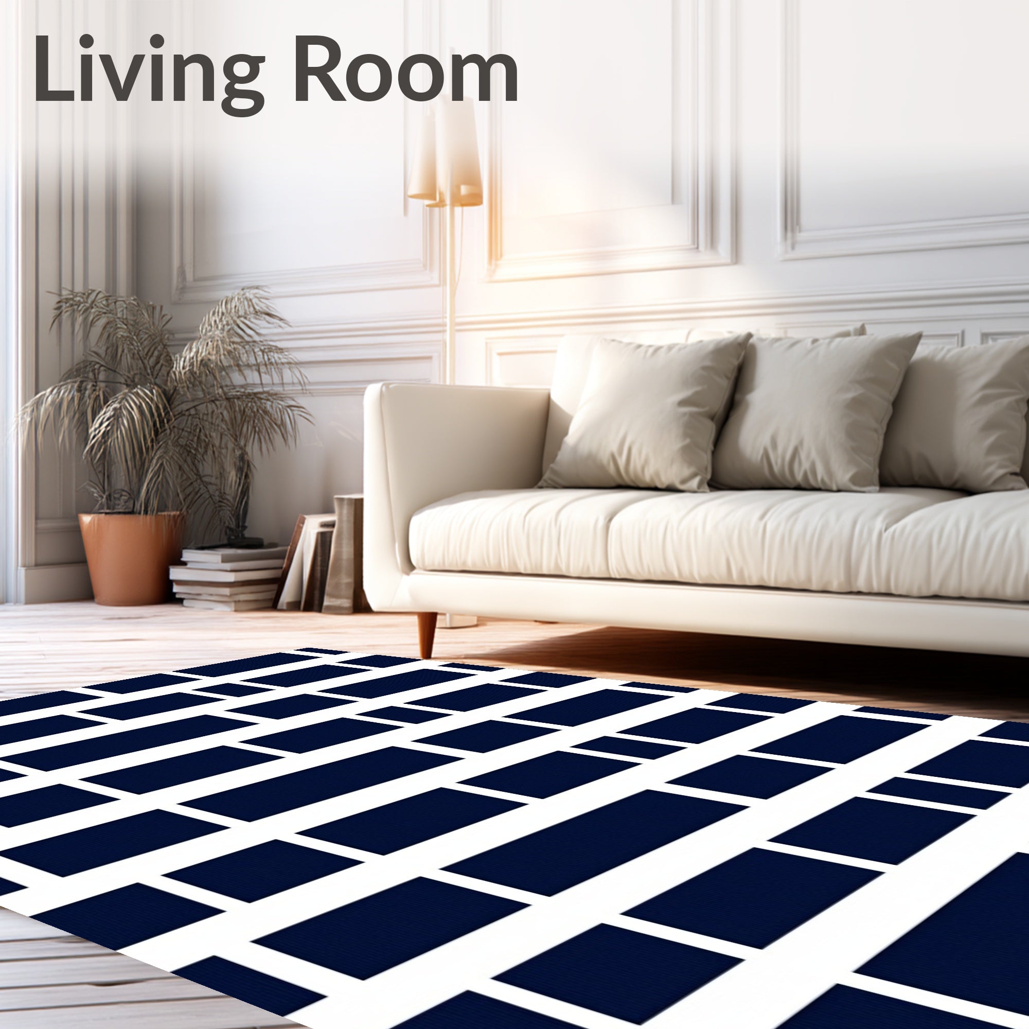 Flatwoven High Traffic Area Rug, Minimalist Grid Layout with Navy and Contrast, Non Slip, Stain Resistant, Washable Area Rugs for Living Room, Bedroom (Blue) Overview: