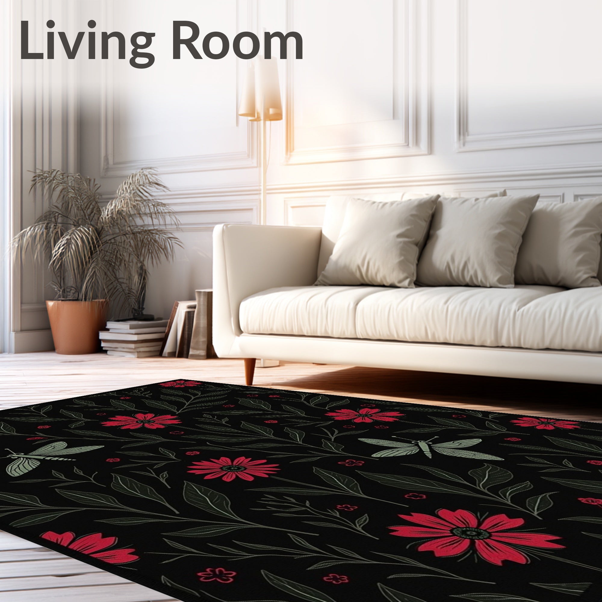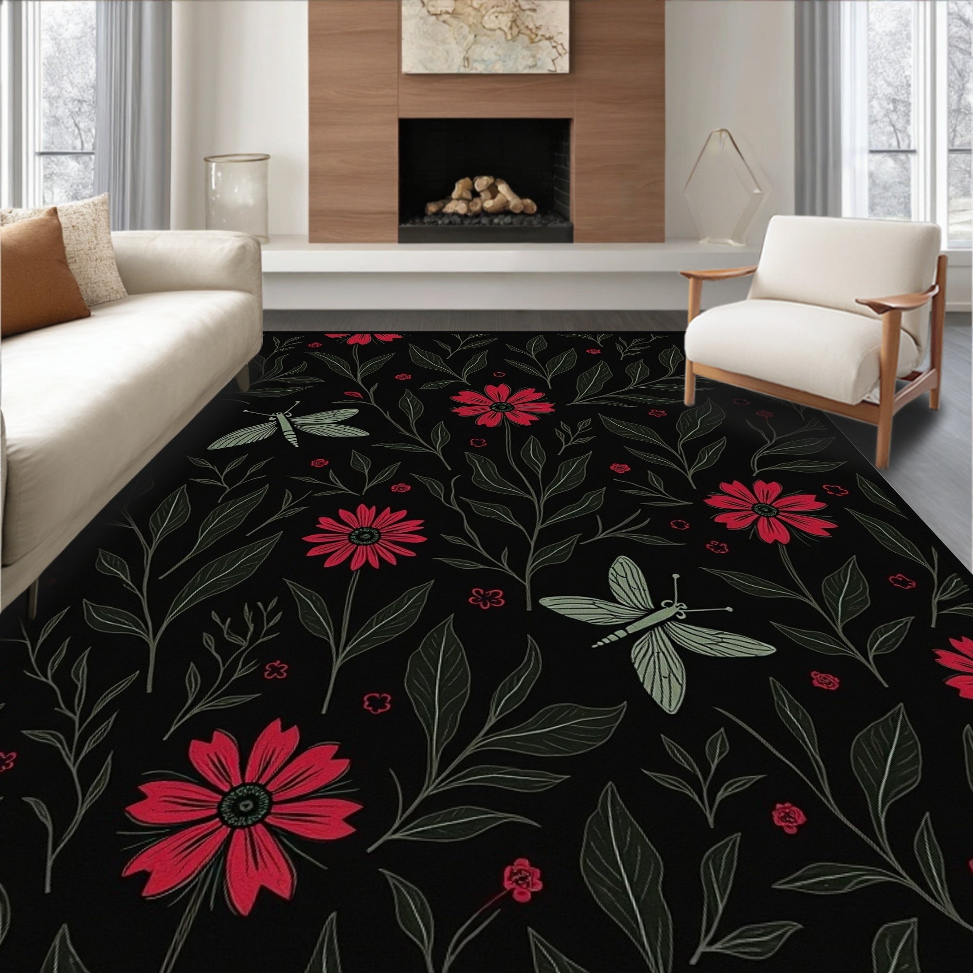 Flatwoven High Traffic Area Rug, Mystical Insect and Bloom Composition Featuring Gothic Floral Arrangements, Non Slip, Stain Resistant, Washable Area Rugs for Living Room, Bedroom (Black) Overview: