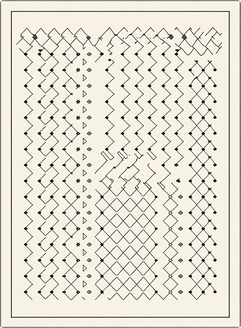 This design is a visual ode stretching from the intricate heritage of Berber weaving to the crisp, intellectual lines of Bauhaus abstraction. It captures the spirit of 'Desert Modernism,' where the raw, sun-drenched honesty of a Southwestern landscape meets the refined sensibilities of a metropolitan gallery. The pattern flows with an intentional imperfection; diamonds rhythmically march alongside zigzags like ink-dipped needles dancing on parchment, creating a hallowed texture that feels both ancient and tomorrow-ready. When placed, the room undergoes a quiet metamorphosis—stark corners soften into curated sanctuaries, and the floor ceases to be a mere surface, becoming a hand-sketched tableau that invites slow joy. It is designed for the heart-led homebuilder who finds beauty in the deliberate and the authentic. Step onto this scene and feel the pulse of a well-lived life. Don't just fill your space—anchor it with a piece that speaks to the soul.