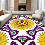Rooted in the spirited lineage of 1960s psychedelic pop-art and the exuberant maximalism of Neo-Tropical decor, this design is a visual anthem for the bold. The central sunflower—a smiling, hallowed sun-deity—radiates golden petals that reach toward a void-white field, dancing in a rhythmic gradient against lush purple framing. It is an ode to the sun-soaked optimism of California midcentury graphics met with the intricate symmetry of traditional Mediterranean folk textiles. When laid upon your floor, the room undergoes a joyous metamorphosis: shadows retreat, the air feels hum-bright with energy, and the four corners of your home pulse with a renewed sense of play. This piece is for the heart-led homebuilder who believes magic belongs in every room and that home should be a sanctuary of uninhibited delight. Don’t just fill your space—ignite it. Walk upon poetry and live in the light.