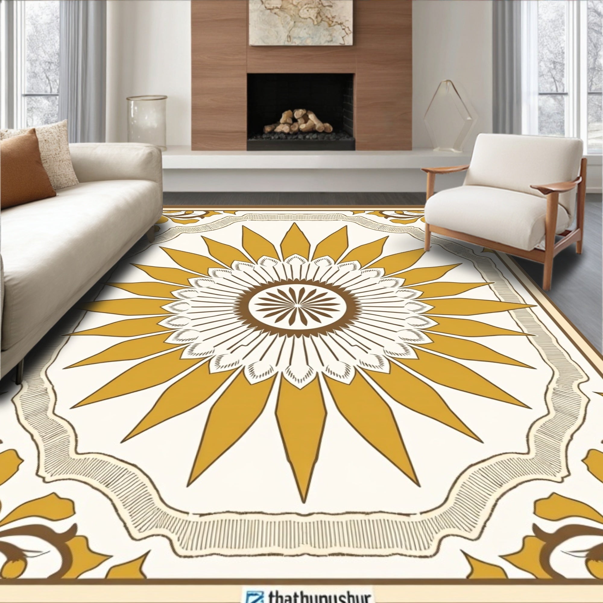 Flatwoven High Traffic Area Rug, Radiant Sunburst Medallion Abstract, Non Slip, Stain Resistant, Washable Area Rugs for Living Room, Bedroom (Gold) Overview: