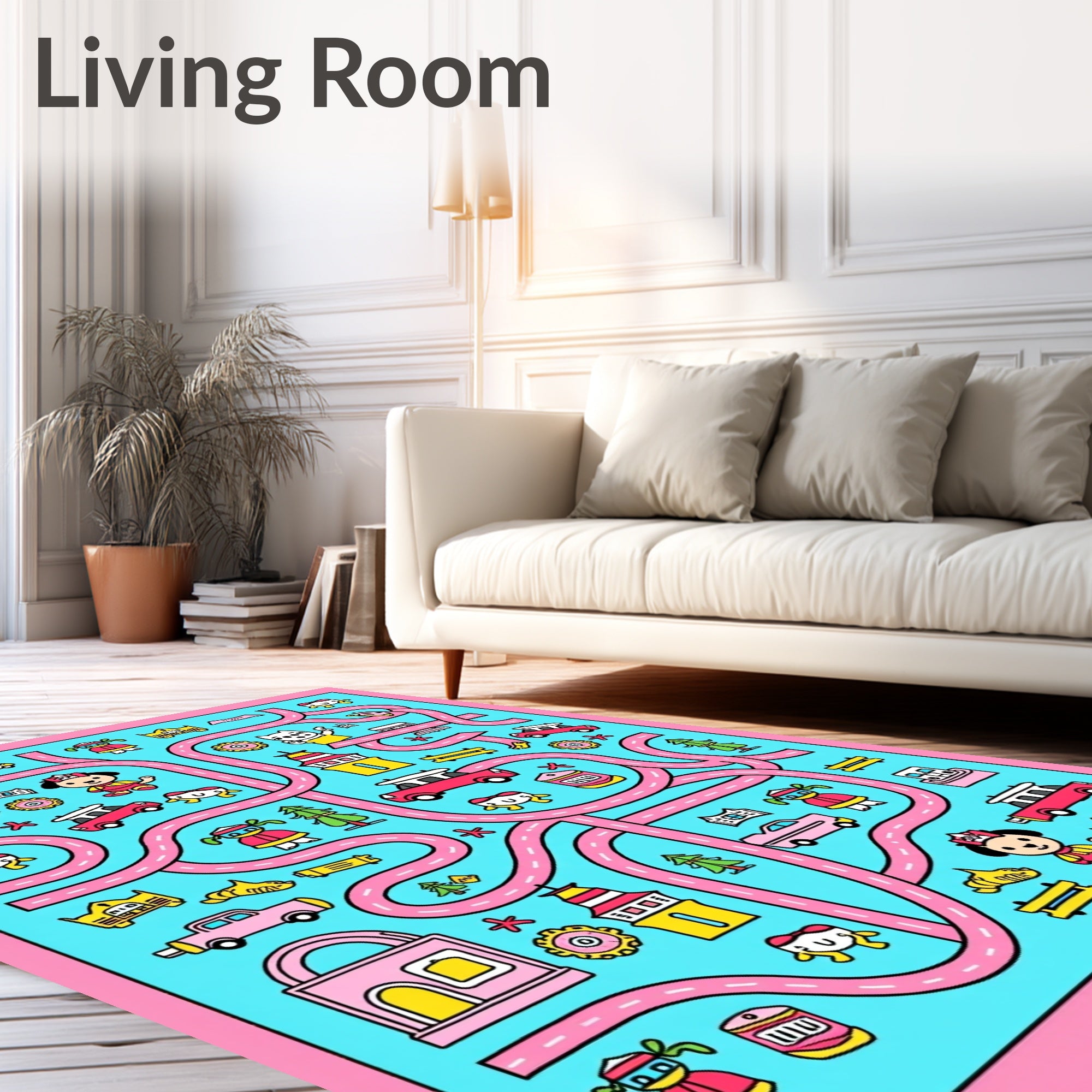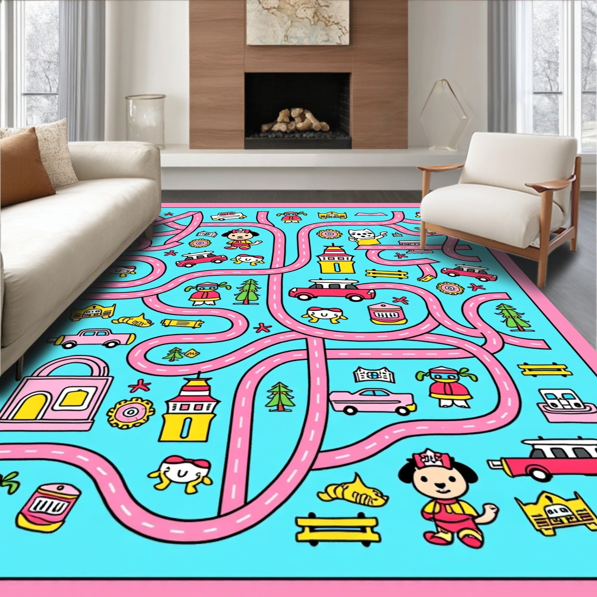 Flatwoven High Traffic Area Rug, Rescue Team Highway Patrol Interactive Playmat Journey Guide, Non Slip, Stain Resistant, Washable Area Rugs for Living Room, Bedroom (Pink) Overview: