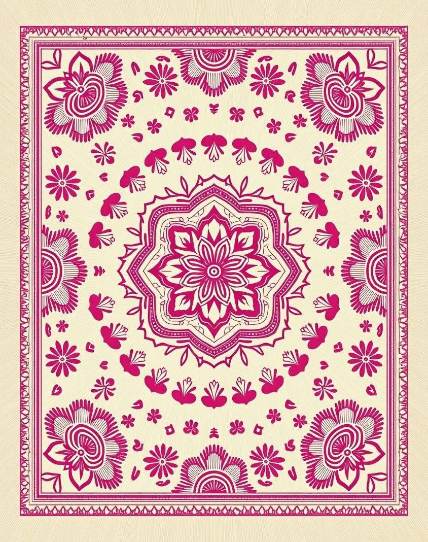 A visual bridge between the ornate woodblock prints of Central European folk art and the spirited geometry of contemporary Maximalism, this design is a celebration of rhythmic vitality. The central mandala acts as a focal point of energetic symmetry, where petals bloom like hallowed suns and borders ripple with the precision of vintage textile stamps. It evokes a Neo-Storytelling aesthetic, reminiscent of hand-painted floral heritage found in sun-kissed alpine villages. As you place this in your home, the atmosphere undergoes a sudden metamorphosis: the floor becomes a vibrant tableau, turning quiet corners into expressive sanctuaries of joy. It is crafted for the heart-led homebuilder who finds beauty in the intersection of tradition and audacity—those who believe that a living space should be as soulful as a heirloom quilt but as resilient as modern life demands. Walk upon poetry and let your space sing in magenta; this is not just a rug, it is a declaration of lived-in color.