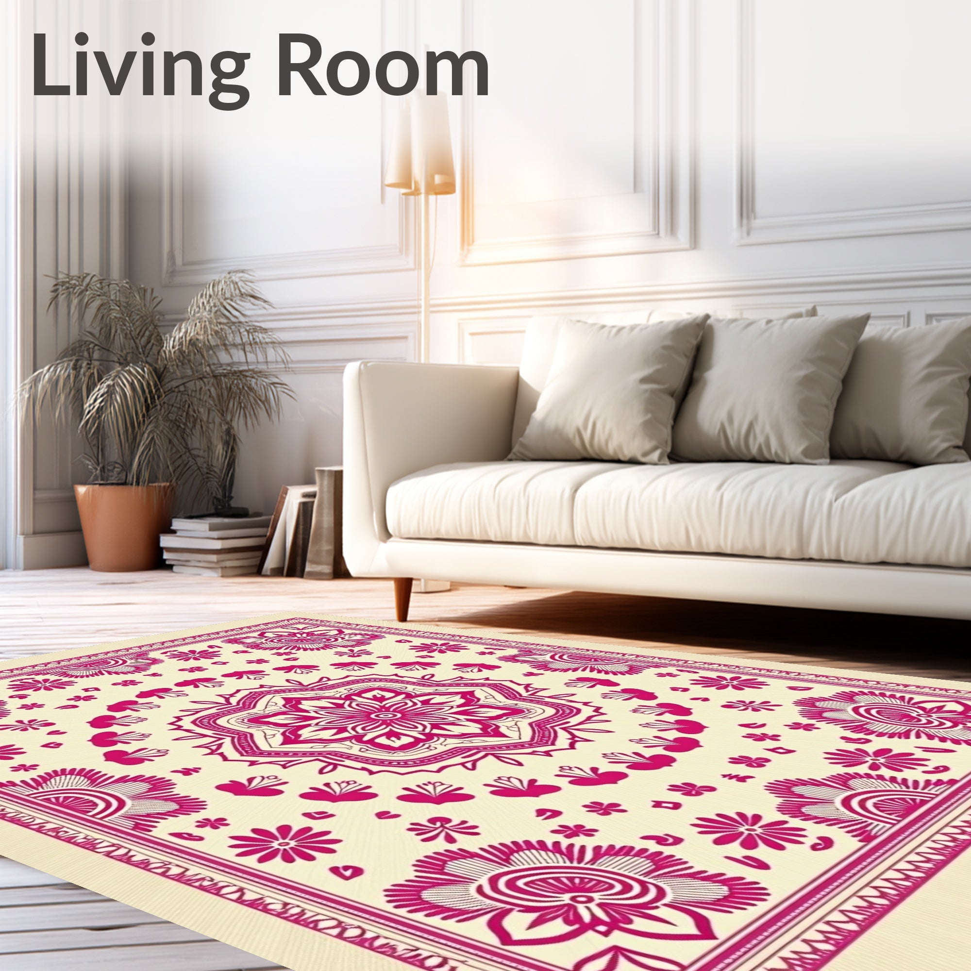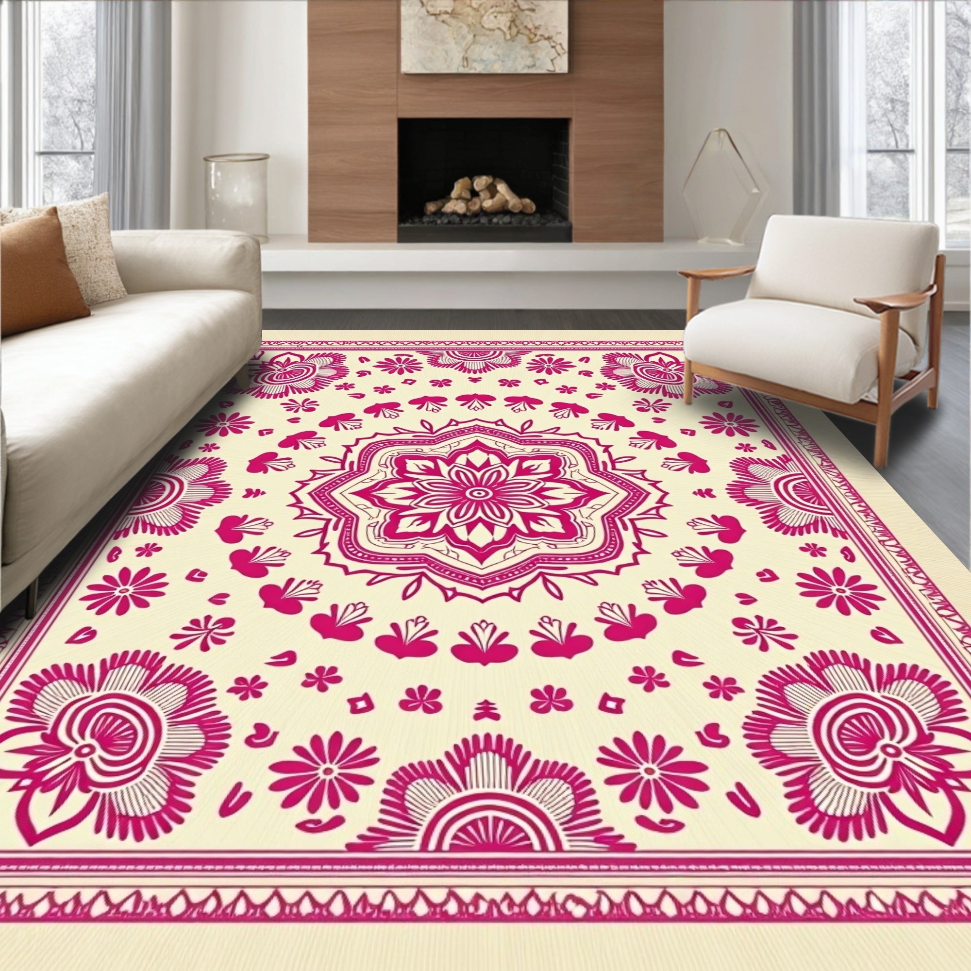 Infuse your home with the vibrant energy of the Radiant Pink Mandala Floral Cream Rug. This traditional yet modern area rug features a striking magenta medallion centered against a warm, sun-drenched cream field. Intricate floral motifs and folk-inspired linework create a rhythmic visual flow that anchors any living room or bedroom. Engineered for the reality of a busy home, this piece is exceptionally durable and machine washable, ensuring the bold pink tones remain vivid over time. Certified to OEKO-TEX Standard 100, it provides a safe, low-maintenance foundation for high-traffic zones. The low pile height ensures a seamless fit under furniture and doors, blending classic Bohemian charm with essential functional longevity.