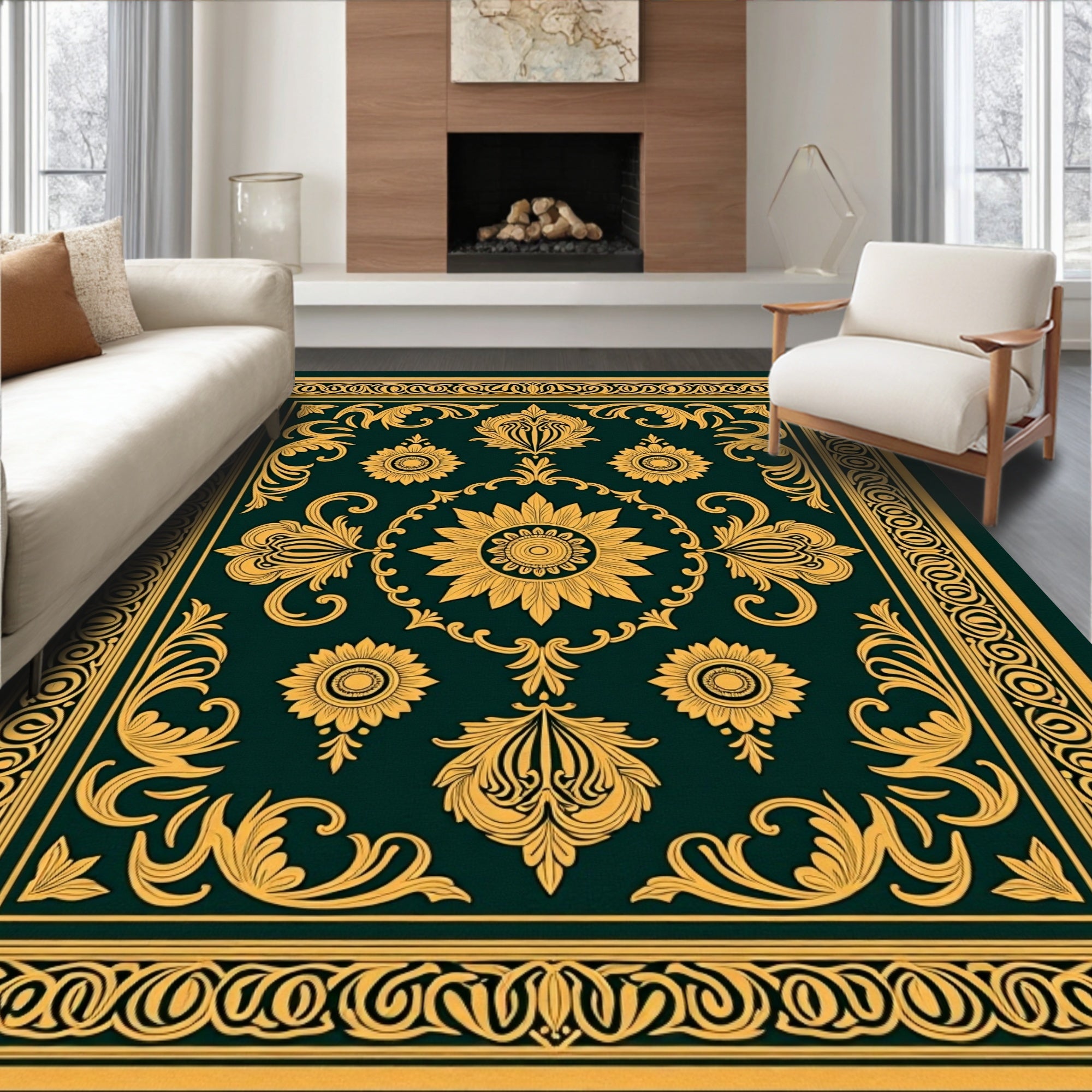 Flatwoven High Traffic Area Rug, Symmetrical Floral Medallion with Interlocking Scrollwork Details, Non Slip, Stain Resistant, Washable Area Rugs for Living Room, Bedroom (Gold) Overview: