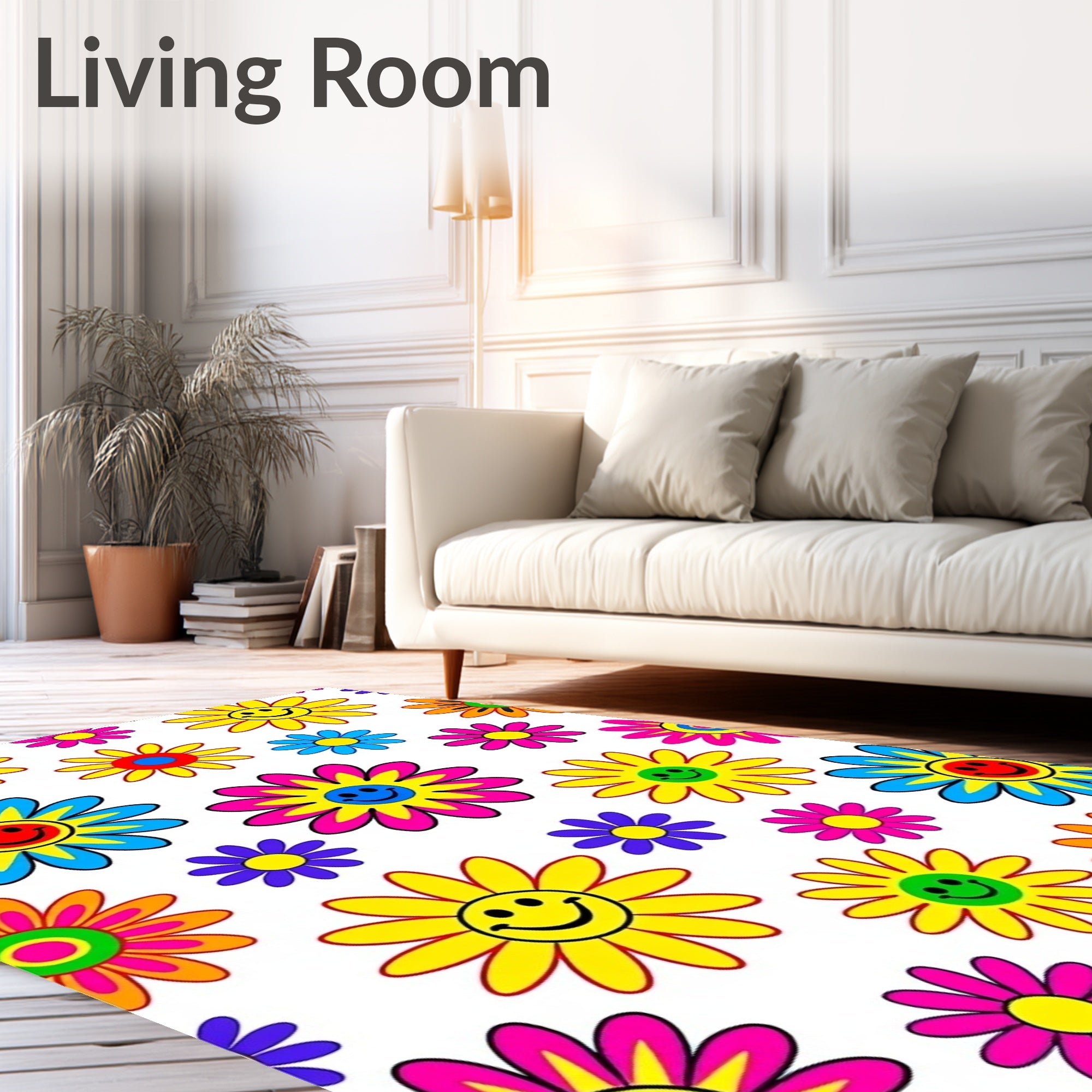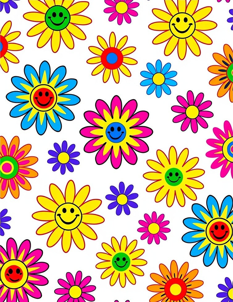 Drawing inspiration from the 1960s psychedelic pop-art movement and the whimsey of midcentury California optimism, this design is a visual ode to the 'Flower Power' era. It captures the sun-kissed energy of a coastal retro-summer, where neon-bright petals and iconic smiley faces dance in a rhythmic, kaleidoscope-like sprawl. Each bloom interacts with a neon-vivid palette, creating a hallowed field of happiness that transforms a sterile room into a sanctuary of slow-joy. Step onto this canvas, and the atmosphere shifts: shadows retreat, a technicolor warmth radiates from the floor, and the hum of the city is replaced by a hushed, playful tranquility. This is for the heart-led homebuilder who believes that interior design should start with a smile and that magic is found in the most spirited corners of our daily lives. Don’t just decorate your floor—anchor your home in a declaration of pure, radiant delight.