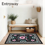 Elevate your living room with this striking Bold Floral Area Rug, where traditional folk heritage meets a contemporary midnight aesthetic. The design features vibrant pink and sea-foam teal botanicals set against a deep black field, framed by a crisp, ivory lattice border. Engineered for the modern home, this rug is as practical as it is beautiful; it is exceptionally durable and fully machine washable, making it perfect for high-traffic entryways or busy family rooms. Certified with the OEKO-TEX Standard 100, it ensures a safe and chemical-free environment. Its low pile height allows for easy door clearance while providing a sleek, low-maintenance surface that fits seamlessly into any modern or boho-inspired space.