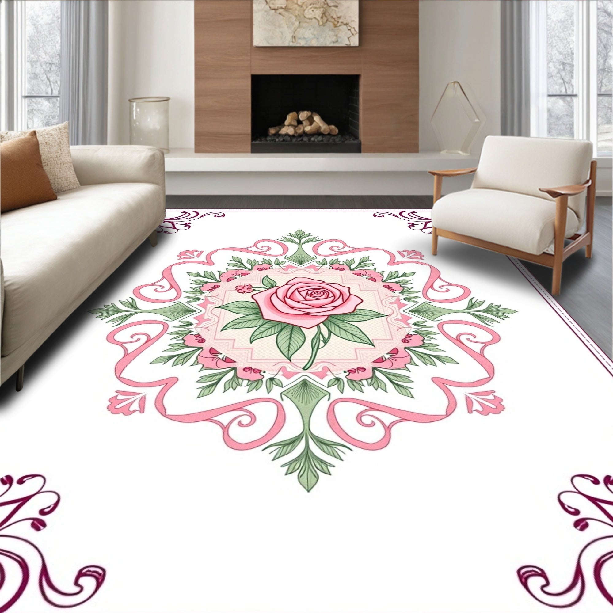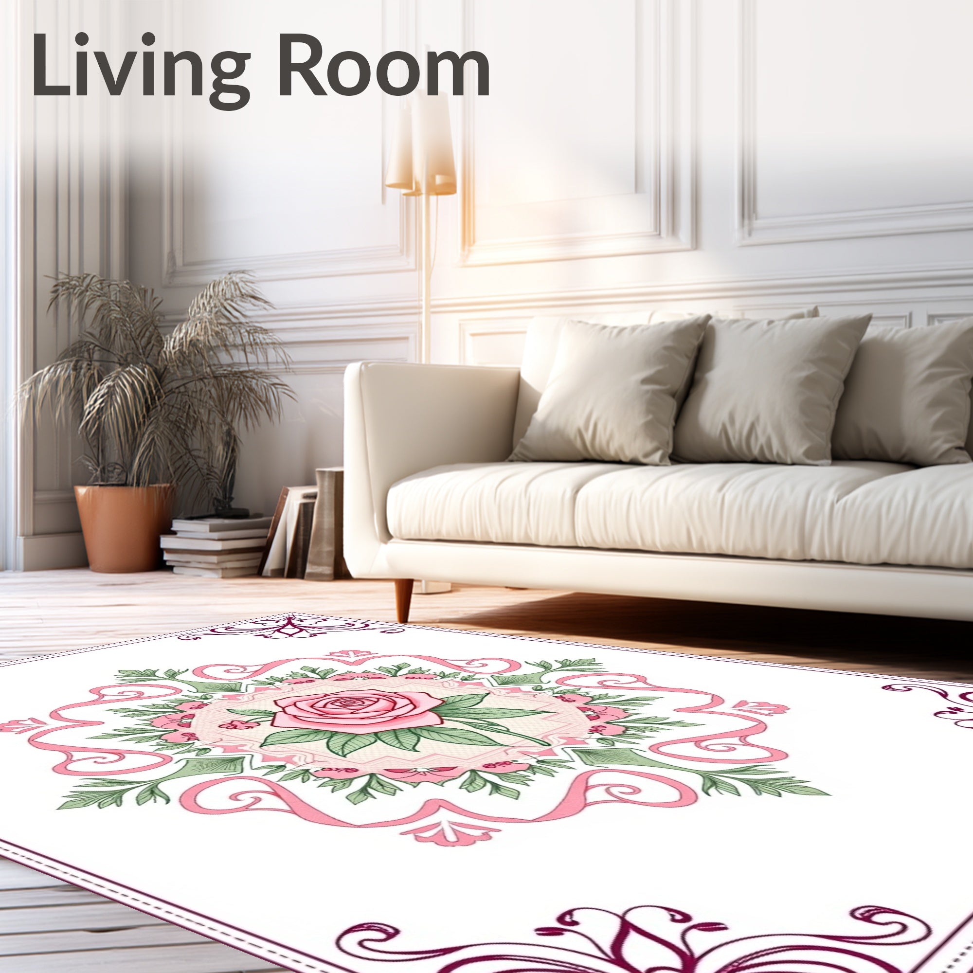 Flatwoven High Traffic Area Rug, Vintage Blossom Medallion with Ornate Ribbon Motifs and Classic Flourishes, Non Slip, Stain Resistant, Washable Area Rugs for Living Room, Bedroom (Pink) Overview: