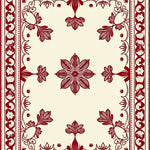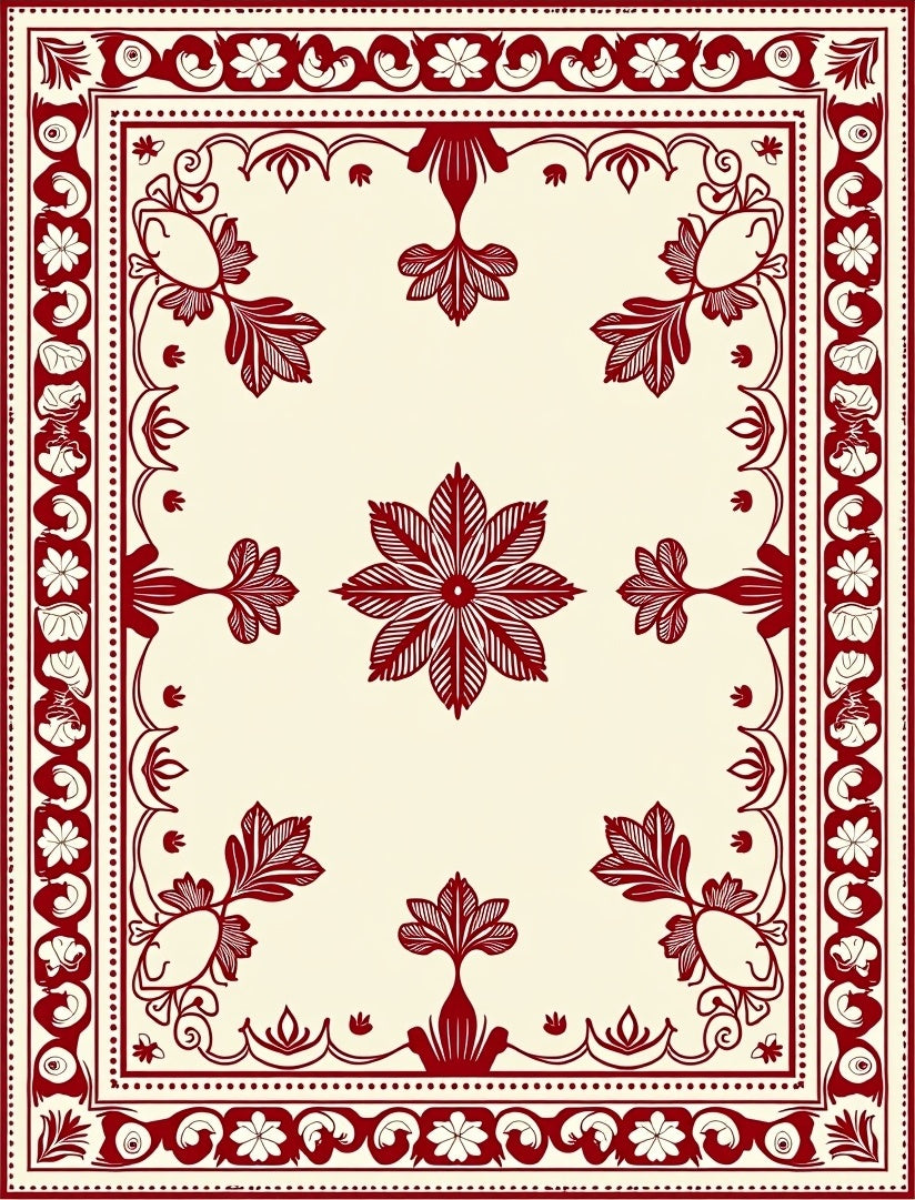 A visual ode to the intricate woodblock prints and textile artistry of Eastern European folk heritage, this design captures the heartbeat of old-world craftsmanship. Crimson petals bloom like steady flames against a parchment-hued field, balanced by a rhythmic border of scrolling vines and delicate daisies that echo the intricate needlework of heirloom tapestries. The interaction of deep maroon and soft beige creates a hushed, gallery-like atmosphere, as if a centuries-old story were unfolding beneath your feet. Step onto this design and the room shifts: modern angles soften, and the contemporary home feels suddenly anchored by history. It is a piece for the heart-led homebuilder who seeks depth over decorum and understands that magic lives in the details of the everyday. For the one who values the slow joy of a curated space, this rug is more than a floor covering—it is a declaration of reverence for the artistry of the past. Walk upon poetry and let your space tell a story of layered, timeless warmth.