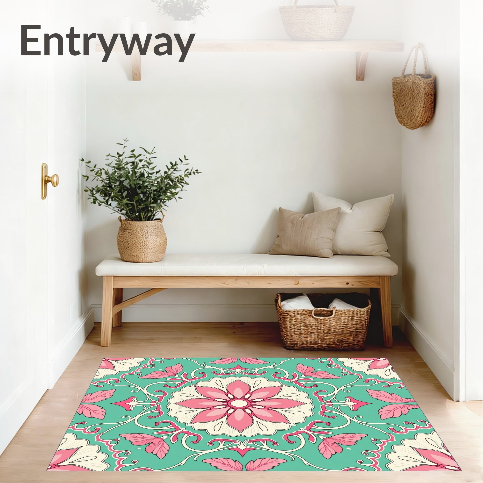 Flatwoven High Traffic Area Rug, Vintage Floral Medallion with Delicate Petal Motifs and Curved Vines, Non Slip, Stain Resistant, Washable Area Rugs for Living Room, Bedroom (Pink) Overview: