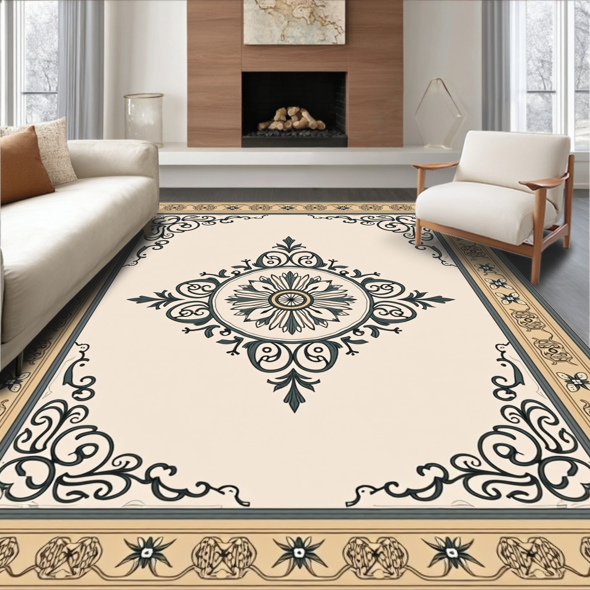 Flatwoven High Traffic Area Rug, Vintage Medallion Scrollwork with Elegant Flourishes and Timeless Motifs, Non Slip, Stain Resistant, Washable Area Rugs for Living Room, Bedroom (Beige) Overview: