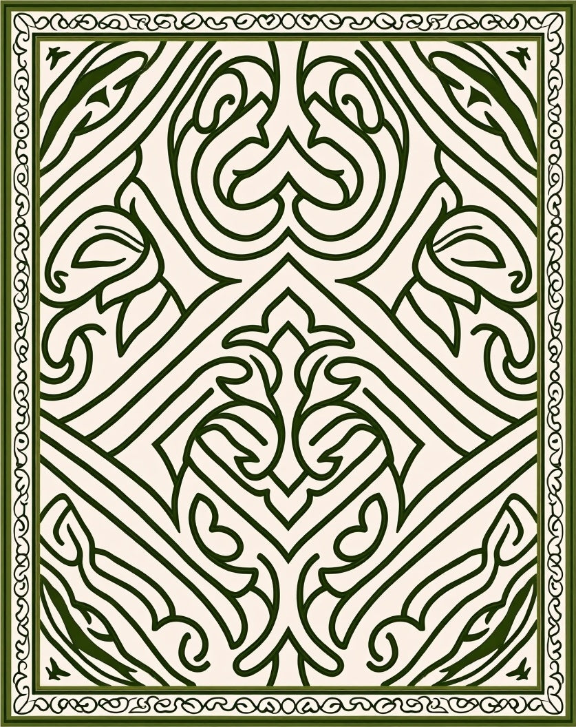 This design is a visual bridge between the botanical organicism of Art Nouveau and the structured geometry of 1920s Art Deco. Drawing inspiration from the grand conservatories of the Gilded Age, the pattern ripples outward like iron-wrought ivy climbing a sun-drenched trellis. Deep, forest-steeped greens etch a lattice of stylized leaves and mirrored hearts across a cream-hued canvas, echoing the sophisticated symmetry of Parisian salon floors. When laid in a room, the architecture of the space feels instantly anchored; the walls seem to realign to the rug's rhythmic pulse, turning a fleeting corner into a permanent sanctuary. It is a piece crafted for the curator of quiet elegance—the homebuilder who seeks the hallowed stillness of a woodland garden within the frame of a modern lifestyle. Don’t just decorate your floor—landscape your soul’s foundation. This is not a rug; it is a declaration of timeless poise. Walk upon poetry and live in reverence.