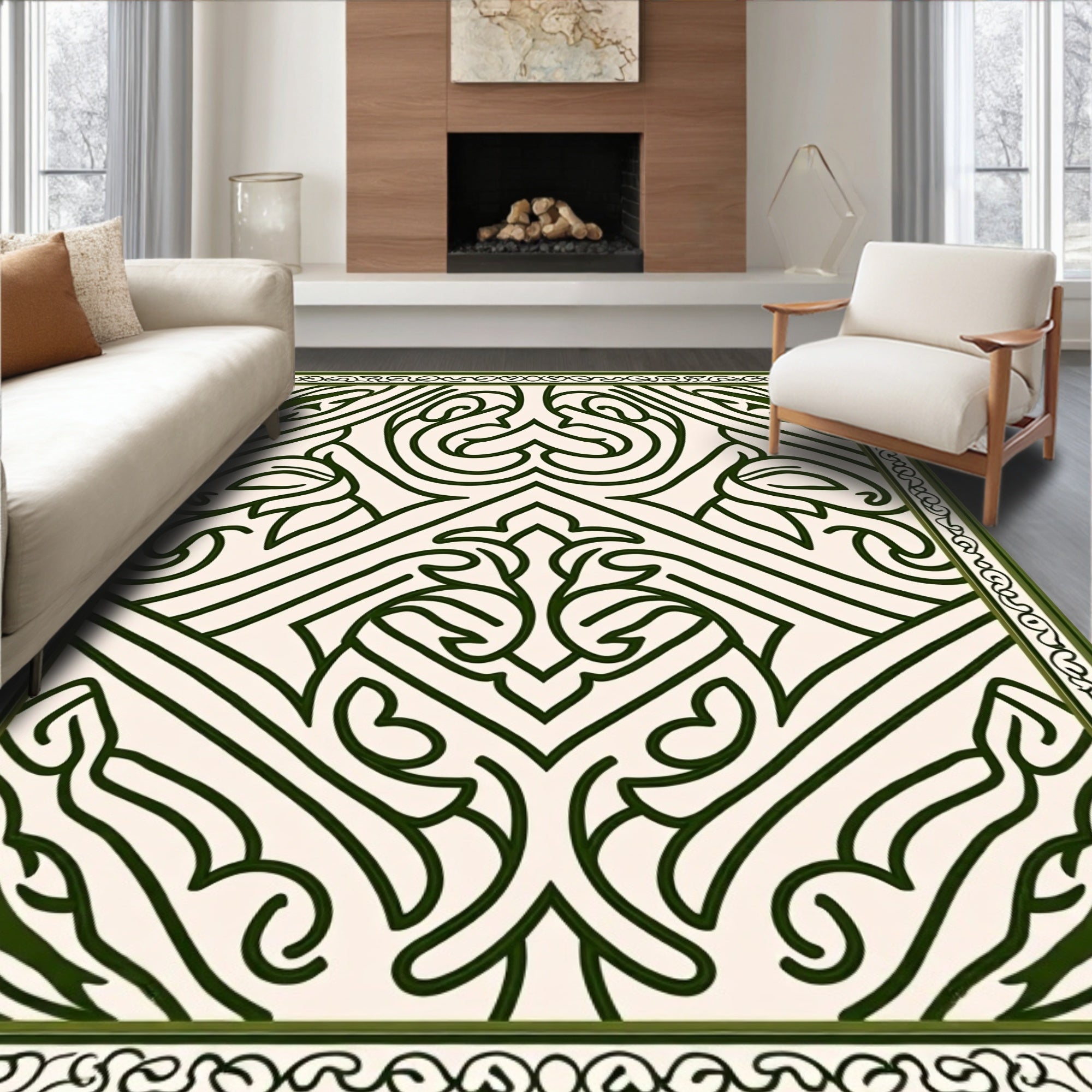 Elevate your living space with this sophisticated Dark Green Ornate Floral Medallion Area Rug. Combining a traditional botanical motif with a bold, modern geometric layout, this rug features a striking contrast between forest green linework and a serene beige ground. It is the ideal Living Room addition for those seeking a balance of luxury and practicality. Constructed to be incredibly Durable, this high-traffic piece is also Machine Washable, ensuring heavy-use areas remain pristine with ease. Certified to OEKO-TEX Standard 100, it guarantees a safe environment for your home. The low-maintenance height allows it to glide seamlessly under doors, making it a versatile choice for any entryway or bedroom.